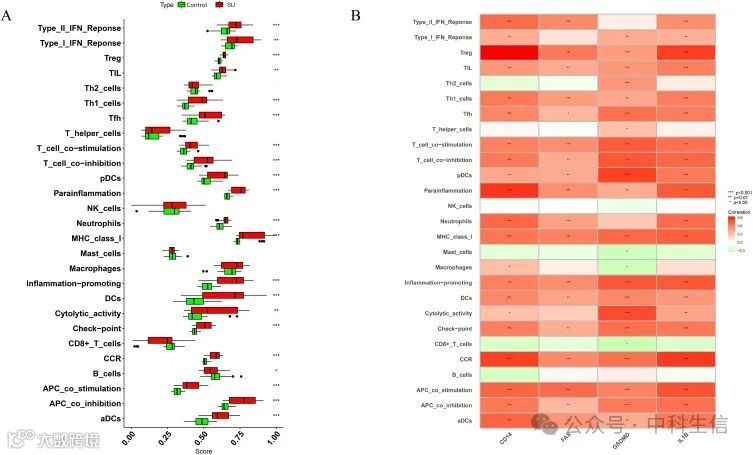 对照组和SLI组免疫细胞和免疫功能的ssGSEA评分结果显示,剔除无统计学意义(p>0.2)的样本后,SLI组的CD8+ T细胞和B细胞低于对照组,其余免疫细胞和免疫功能均高于对照组(p<0.2)(图5A)。特征基因与免疫相关性的热图显示,GSDMD与肥大细胞、巨噬细胞、CD8+ T细胞呈负相关,而与其他细胞呈正相关。剔除无统计学意义的条目后,CD14、FAS和IL1β与其余所有免疫细胞和免疫功能呈正相关(图 5B)。