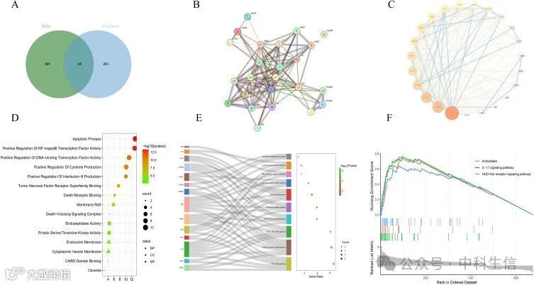 之后构建了PPI网络来探索SPAN_DEGs之间的相互关系,PPI网络中共有24个节点和118条边(图2B)。为了进一步探究这些基因的重要性,节点的大小和颜色取决于其程度,节点之间联系的紧密程度用综合得分来表示(图 2C)。前15个GO术语显示在气泡图中(图 2D)。BP富集结果显示,SPAN_DEGs主要富集在细胞凋亡过程、核因子卡巴B(NF-κB)转录因子活性的正向调控、DNA结合转录因子活性的正向调控、细胞因子产生的正向调控、IL-8产生的正向调控等方面。CC富集结果显示其与膜筏、死亡诱导信号复合物、内质体膜、细胞质囊泡膜、洞穴有关。MF富集显示,SPAN_DEGs主要富集于肿瘤坏死因子受体超家族结合、死亡受体结合、内肽酶活性、蛋白丝氨酸/苏氨酸激酶活性、Caspase招募结构域(CARD)结合。KEGG富集分析表明,SPAN_DEGs主要富集在TNF信号通路、NOD样受体信号通路、细胞膜DNA传感通路、Toll样受体信号通路、NF-kappa B信号通路中(图2E)。GSEA分析结果显示,SPAN_DEGs主要参与IL-17信号通路、NOD样受体信号通路(图2F)。总之,这些结果表明,NOD样受体信号通路和TNF信号通路是主要通路,表明它们可能参与了炎症反应和氧化应激。