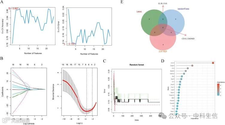 通过SVM-RFE机器学习算法共获得了5个预测特征基因(CD14、GSDMD、DYNLL1、PSMD9和STAT3)(图 3A)。通过LASSO回归分析,从具有统计学意义的变量中筛选出7个预测特征基因(CD14、IL1β、TNF、IRF1、GSDMD、SNAI2和FAS)(图 3B)。通过RF算法筛选出相对重要的前10个基因(CD14、CASP4、IL1β、FAS、MYD88、GSDMD、BID、STAT3 和 IRF1)(图 3C 和 D)),。最后,用维恩图(Venn diagram)表明,通过上述三种机器学习算法的交集,找到了相互重叠的四个特征基因(CD14、GSDMD、IL1β和FAS)(图 3E)。