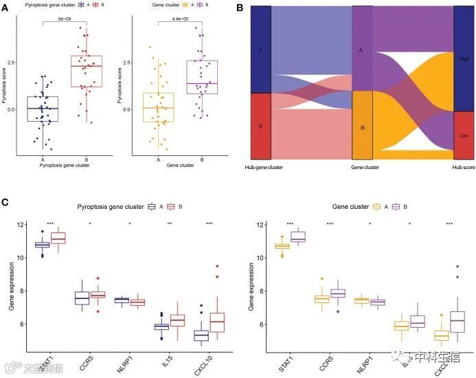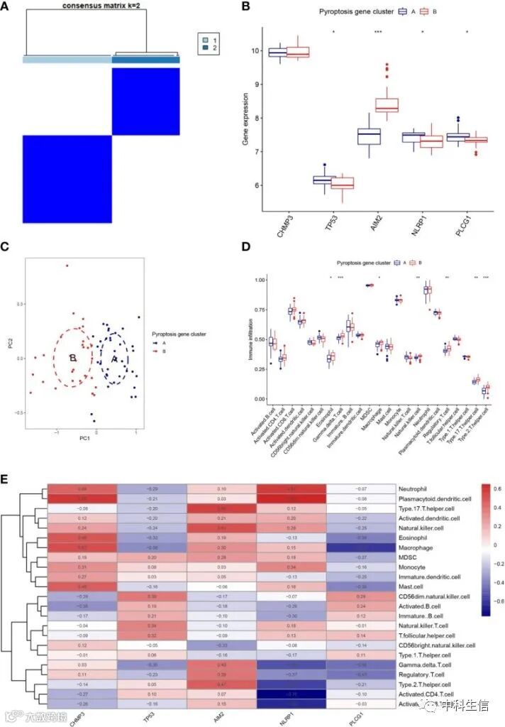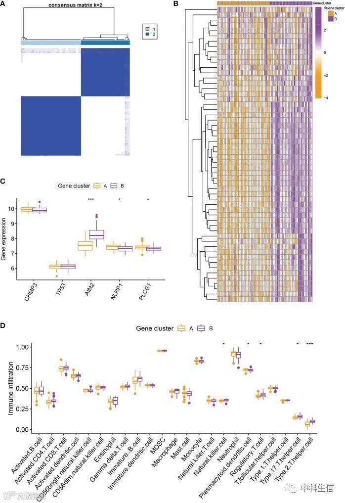 为了进一步验证细胞焦亡模式,我们基于上述的差异表达基因将RA患者分为基因簇A和B,其中基因簇A37例,基因簇B30例。此外,我们发现基因簇A和B之间5个显著PRGs和免疫细胞浸润的差异表达水平与细胞焦亡模式一致。