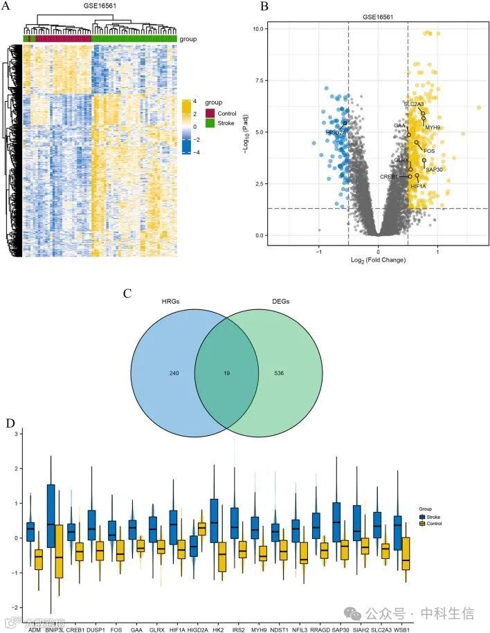 图1中的流程图显示了本研究的概况。分析数据来自在线GEO数据库。获取GSE16561数据集中39个IS全血样本和24个对照全血样本的数据,包括基因表达谱和临床信息,按照以下标准鉴定出555个DEGs:|logFC|≥0.5,adj. p.值<0.05。火山图显示了DEGs中427个上调基因(76.9%)和128个下调基因(23.1%)(图2A,B)。通过交叉259个HRGs,维恩图显示了19个差异表达的HRGs(HIF1A、HIGD2A、CREB1、FOS、ADM、BNIP3L、DUSP1、GAA、GLRX、HK2、IRS2、MYH9、NDST1、NFIL3、RRAGD、SAP30、SIAH2、SLC2A3和WSB1)(图 2C)。图2D显示了这19个基因在GSE16561中的表达情况。从图中数据可以看出,除HIGD2A外,其他基因在IS样本中均出现了上调。