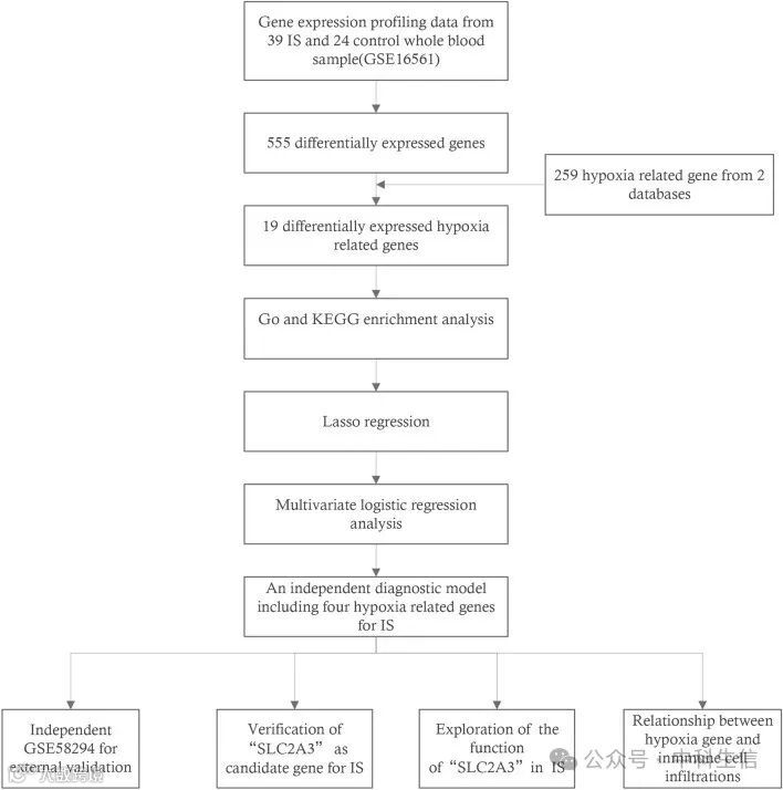 今天小编和大家分析一篇23年6月发表在Scientific Reports(IF:4.6)杂志的文章《Identification of hypoxia-related genes and exploration of their relationship with immune cells in ischemic stroke》。缺血性中风(Ischemic stroke,IS)是人类健康的一大威胁,也是导致长期残疾和死亡的第二大原因。脑灌注受损导致急性缺氧和葡萄糖缺乏,进而诱发中风级联反应,最终导致细胞死亡。筛选和鉴定缺氧相关基因(hypoxia-related genes,HRGs)和治疗靶点对于脑神经保护非常重要,可在药物和机械溶栓之前防止损伤并延长时间窗以进一步改善功能预后。我们的研究结果表明,HRGs在IS免疫微环境的多样性和复杂性中起着至关重要的作用。探索缺氧相关关键基因与免疫细胞之间的关联为IS的治疗靶点提供了创新性见解。