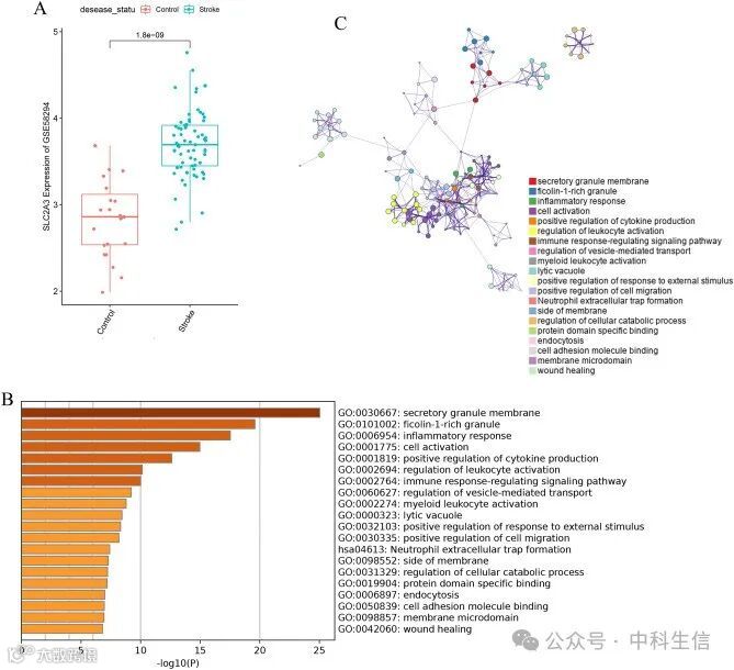 如图5所示,在四个缺氧基因中,SLC2A3在区分IS患者和对照样本方面表现最好。为了进一步检测SLC2A3在IS中的特性,我们对GSE58294数据集进行了分析。与对照样本相比,IS患者的SLC2A3表达水平更高(图6A)。初步分析结果表明,SLC2A3可能是IS的一个重要候选基因。为了确定SLC2A3的相关基因,研究人员对SLC2A3与患者样本中555个差异表达基因进行了Spearman相关性分析。其中有296个差异表达基因与SLC2A3显著相关(p < 0.05)。此外,还应用Metascape进行了功能富集分析。从图中可以看出,这些基因明显富集在中性粒细胞脱颗粒和免疫反应调节信号通路中,而这两个通路与IS密切相关(图6B,C)。