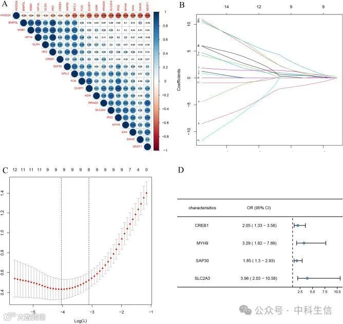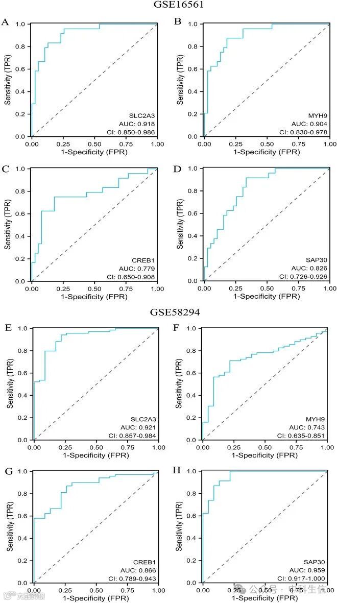 从图4A的相关矩阵分析图中可以看出,19个基因之间有很强的相关性,部分缺氧基因之间也有很强的相关性。为了解决回归分析中的多重共线性问题,我们采用了LASSO分析法,进一步扩大了HRGs作为IS诊断生物标志物的范围。19个基因被纳入LASSO模型。首先,根据lambda.1se确定了9个基因(CREB1、FOS、GAA、GLRX、HIF1A、HIGD2A、MYH9、SAP30、SLC2A3)(图 4B,C)。然后,利用多变量逻辑回归分析确定了独立的候选诊断生物标志物。得到了四个基因(SLC2A3、MYH9、CREB 和SAP30)(图4D)。此外,这四个生物标志物在鉴别IS与对照组方面表现出了良好的诊断能力和诊断价值。如图5所示,SLC2A3、MYH9、CREB1和SAP30的值分别为0.918(95% CI 0.850,0.986)、0.904(95% CI 0.830,0.978)、0.779(95% CI 0.650,0.908)、0.826(95% CI 0.726,0.926)。此外,为了评估这四个基因的临床益处,我们使用ROC曲线来证明它们在鉴别IS诊断中的价值。我们还利用GSE58294数据集验证了四个HRGs生物标志物的诊断准确性。从图5中可以看出,SLC2A3、MYH9、CREB1和SAP30的诊断准确率分别为0.921(95% CI = 0.857,0.984)、0.743(95% CI = 0.635,0.851)、0.866(95% CI = 0.789,0.943)和0.959(95% CI = 0.917,1.000)(图5)。