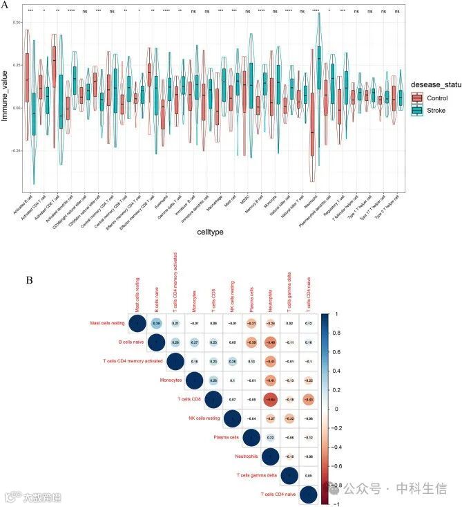 IS患者的NK细胞、中性粒细胞、活化树突状细胞、嗜酸性粒细胞和记忆B细胞的比例明显高于对照组样本。但是,IS患者中活化CD8 T细胞和活化B细胞的比例大大低于对照组织(图7A)。缺血性脑卒中免疫细胞亚群之间的相关热图显示,浆细胞与B细胞的天真程度呈负相关。中性粒细胞与T细胞(CD8)、B 细胞(幼稚型)明显相关,而T细胞(CD4记忆激活型)与T细胞(CD8)呈负相关。静息的 NK 细胞与 CD4 记忆激活的 T 细胞和 CD8 T 细胞呈正相关(图 7B)。