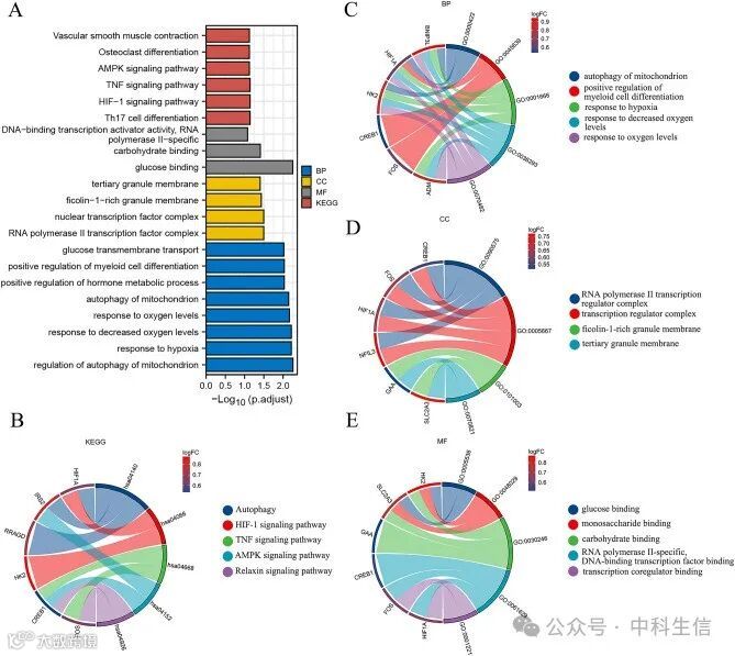 KEGG富集显示,19个HRGs主要参与自噬,HIF-1信号通路,AMPK信号通路,TNF信号通路,生长激素的合成、分泌和作用,Th17细胞分化,TNF信号通路,Relaxin信号通路(图 3A,B)。BP显示,所选基因主要富集于线粒体自噬调控、对缺氧的反应、对氧水平降低的反应、对氧水平的反应以及对髓系细胞分化的正向调控(图3C)。在CC中,HRGs主要与RNA聚合酶II转录因子复合物、核转录因子复合物、转录因子复合物和三级颗粒膜相关(图3D)。MF显示,19个HRGs主要与转录核心抑制因子活性、单糖结合、葡萄糖结合、单糖结合和RNA聚合酶II特异性DNA结合转录因子结合有关(图3E)。