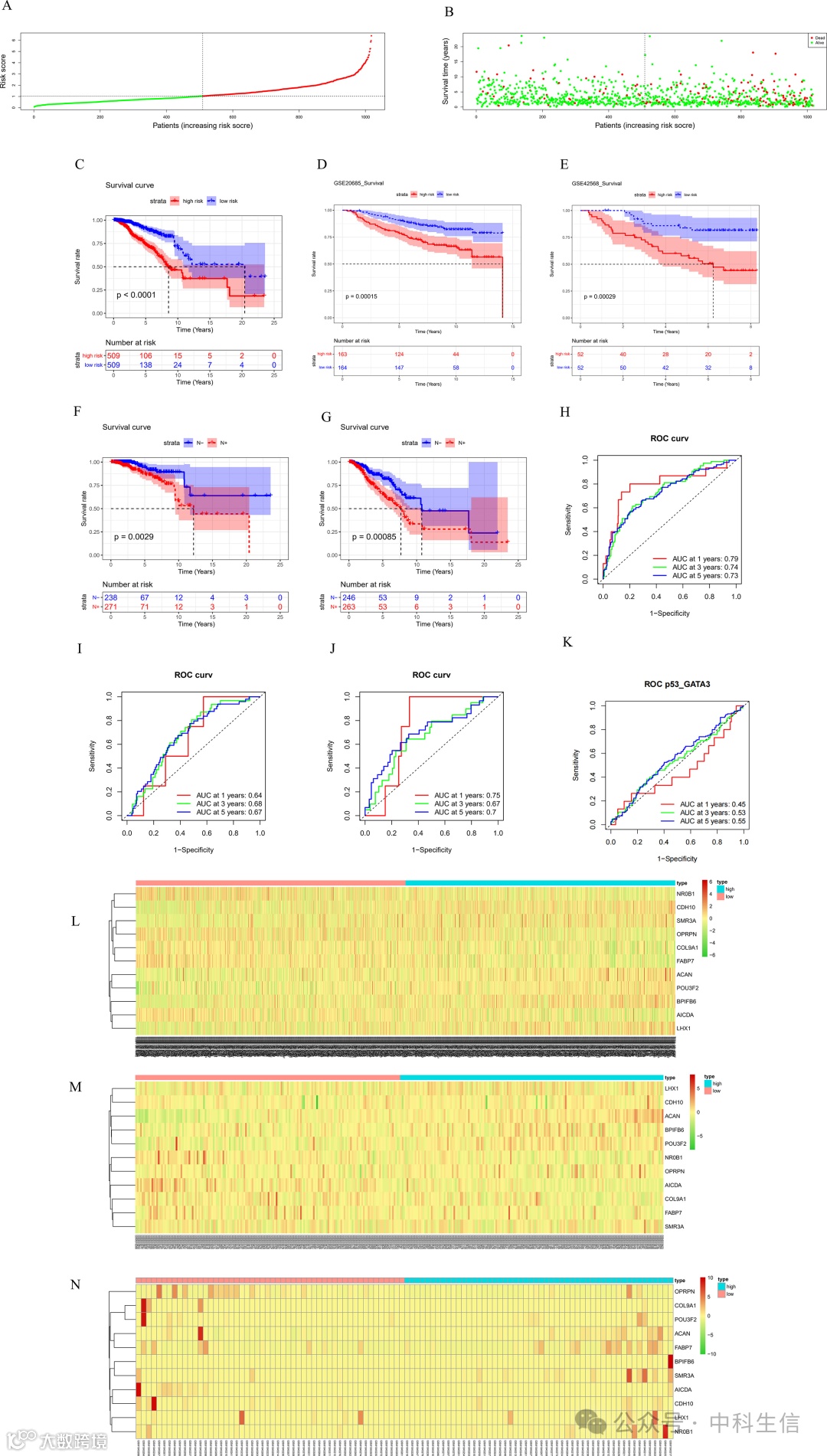 为了测试模型的预测潜力,计算训练集中所有样本的风险评分,并根据风险评分的中值将训练集中的BC样本分为高风险组和低风险组(图2 A)。随后的生存分析显示,低风险BC患者的生存时间更长,生存率更高(图2B-C)。在两个验证集中,高危组的生存率显著降低(图2D-E)。此外,值得注意的是,在两个风险组中,LNM(N+)患者的生存率明显低于没有 LNM(N-)的患者(图 2F-G)。这些结果确定了模型的良好分类性能。然后,使用 R 包分析训练集(TCGA 数据集)和验证集(GSE20685数据集和GSE42568数据集)中的样本数据,并绘制了 1 年、3 年和 5 年 ROC 曲线。结果表明,在训练集中,ROC曲线在1年、3年和5年的AUC值分别为0.79、0.74和0.73(图2H)。验证集GSE20685中 1 年、3 年和 5 年 ROC 曲线的 AUC 值分别为 0.64、0.68 和 0.67(图 2I),验证集 GSE42568 的 AUC 值分别为 0.75、0.67 和 0.7(图 2J)。此外,本研究还将预后模型的性能与TCGA数据集中p53和GATA3的性能进行了比较,结果表明本研究模型具有更好的性能和更高的AUC值(图2K)。综上所述,成功构建了具有良好预测性能的BC患者LNM相关风险预后模型。