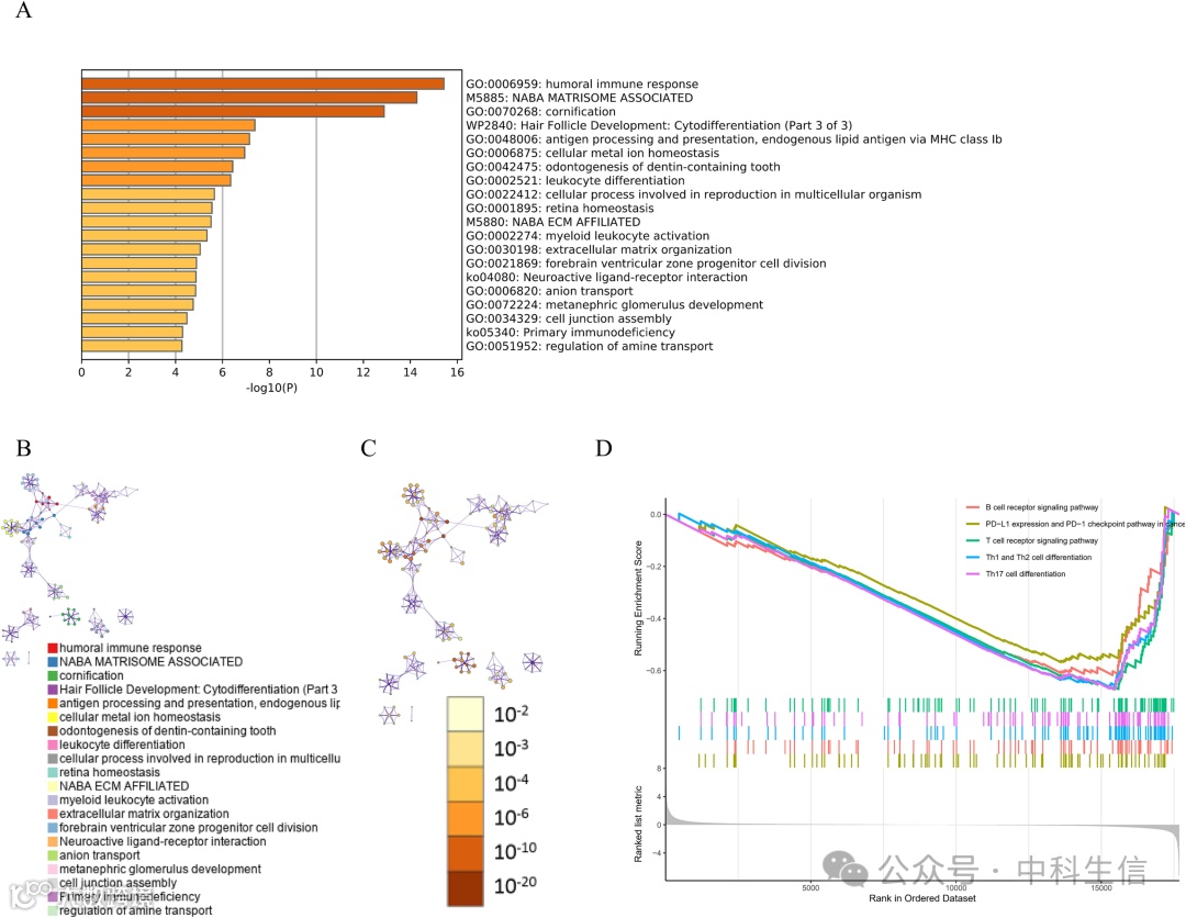 对训练集中两个风险组的样本数据进行差异分析,获取310个DEGs。为了阐明这些 DEG 可能参与的生物学过程,我们首先使用 metascape 数据库进行了富集分析,结果显示这些 DEG 在体液免疫反应、原发性免疫缺陷和其他免疫相关生物学功能和途径中的富集(4A-C).随后,使用 R 包对它们执行 GSEA。R包分析结果显示,癌症中B细胞受体信号通路、PD-L1表达和PD-1检查点通路中DEGs富集(4D)。