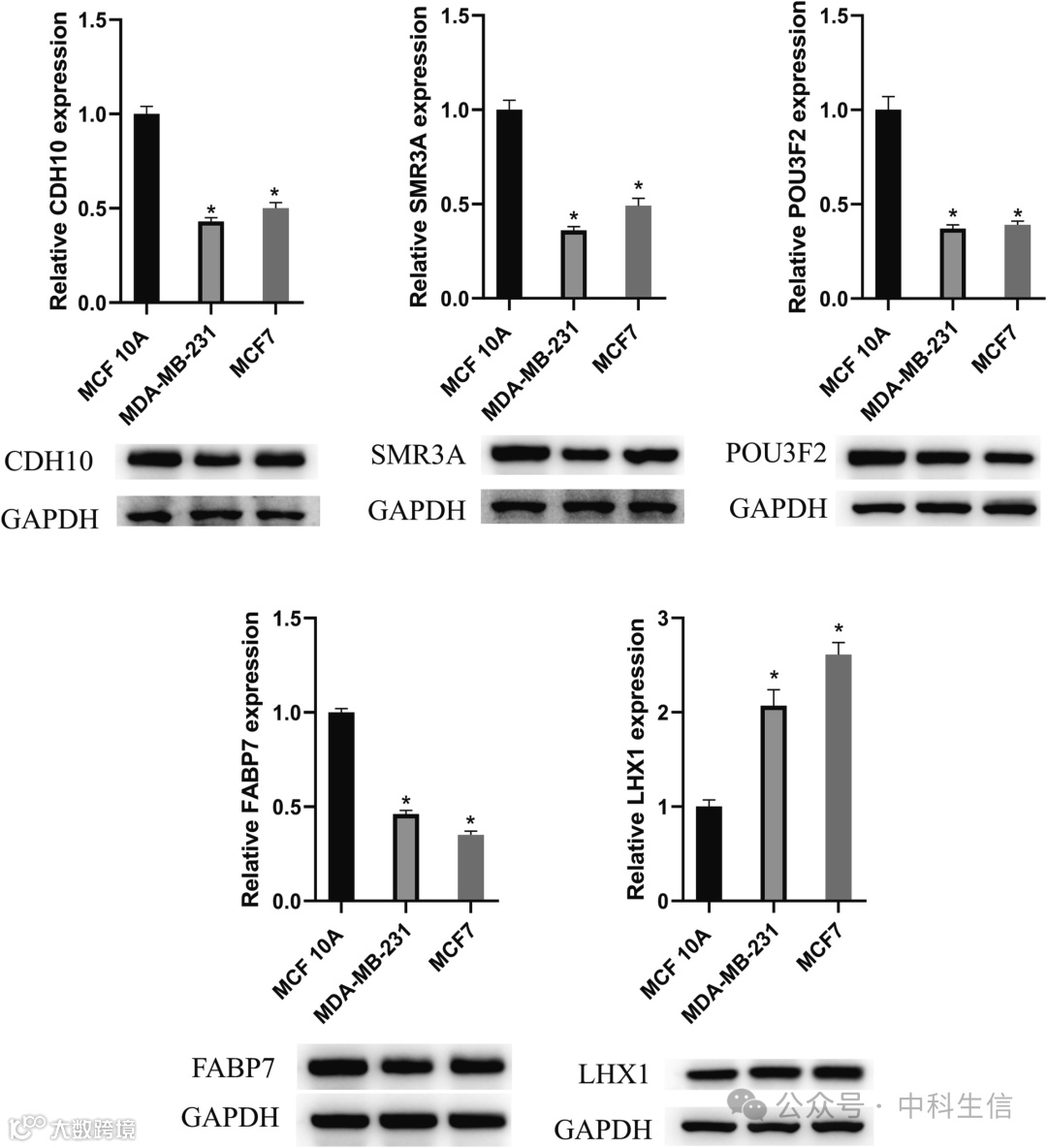 模型基因中的一些基因被报道与BC患者的预后密切相关。因此,对这些基因在BC细胞中的表达进行了进一步验证。与数据库结果一致,CDH10、SMR3A、POU3F2、FABP7基因及其对应蛋白在BC中下调,而LHX1上调(图9)。