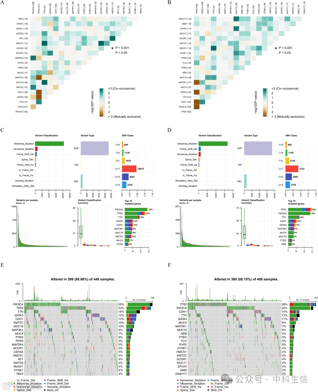 基因突变会影响癌症的进展,对高危和低危人群的基因突变进行了相关性分析。对前 20 个突变基因的相关性分析确定了高危组 GATA3 和 MUC4 以及 TP53 和 PIK3CA 的相互排斥突变(图 7A)。最值得注意的是,在低风险组中,MAP3K1 和 TP53 是相互排斥的突变(图 7B)。这意味着这3对基因可能在肿瘤的发展中起相反的作用。此外,我们还发现,高危组和低危组的大多数突变是错义突变,其中大部分是C-T突变(图7C-D)。PIK3CA在高危组的突变频率最高,而TP53在低危组的突变频率最高(图7E-F)。