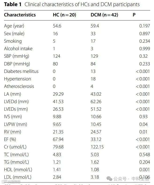 在心脏超声参数和基础疾病方面观察到HC和DCM之间存在显着差异(表1)。作为冠状动脉疾病的危险因素,高血压(HTN)和2型糖尿病(DM)在ICM患者中更为普遍。在ICM中观察到区域室壁运动异常(RWMA)和冠状狭窄(Gensini)评分,与IDCM形成鲜明对比(表2)。重要的是,ICM组和IDCM组的患者由于未咨询或不规律的药物给药,既往用药的比例较低。