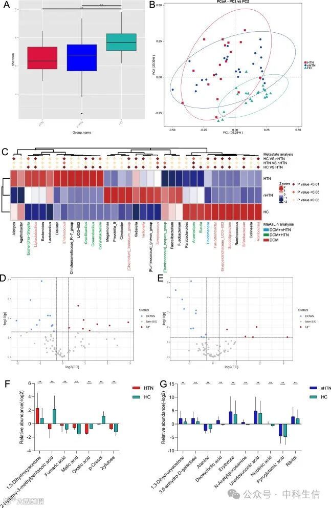 同样,我们根据HTN状态将DCM患者进一步分为两个亚组(合并HTN的DCM, DCM-HTN, n = 18)和非HTN的DCM, DCM- nhtn, n = 24)。与此一致,Kruskal-Wallis的测试显示,DCM-HTN和DCM-nHTN组的Shannon指数低于HC组(图4A)。PCoA表明,DCM-HTN和DCM-nHTN个体的微生物群落与hc显著不同(图4B)。为了确定与HTN相关的微生物谱,使用亚转移分析探索了肠道微生物群的组成。在属水平上,该分析显示与HC相比,DCM-HTN和DCM-nHTN分别有19个和18个不同的丰富分类群(图4C)。调整混杂因素后,DCM-HTN患者中大肠杆菌-志贺氏菌、Gracilibacillus、Oceanobacillus和棒状杆菌的相对丰度较高,HC患者中[Ruminococcus]_torques_group、厌氧stipes和Blautia的相对丰度较高。我们发现与HC相比,DCM-nHTN患者中Holdemanella的相对丰度降低。此外,与HC组相比,两个DCM亚组中有10个属发生了显著变化(图4C)。如上所述,在与HTN状态相关的DCM亚组中也发现了粪便代谢物的变化。目前,在DCM- htn和DCM- nhtn组中分别鉴定出19和16种显著改变的代谢物,如火山图所示(图4D, E)。校正混杂因素后,两组DCM中有一种代谢物明显高于HC。DCM-HTN中的6种代谢物和DCM-nHTN中的9种代谢物与HC明显不同(图4F、G)。