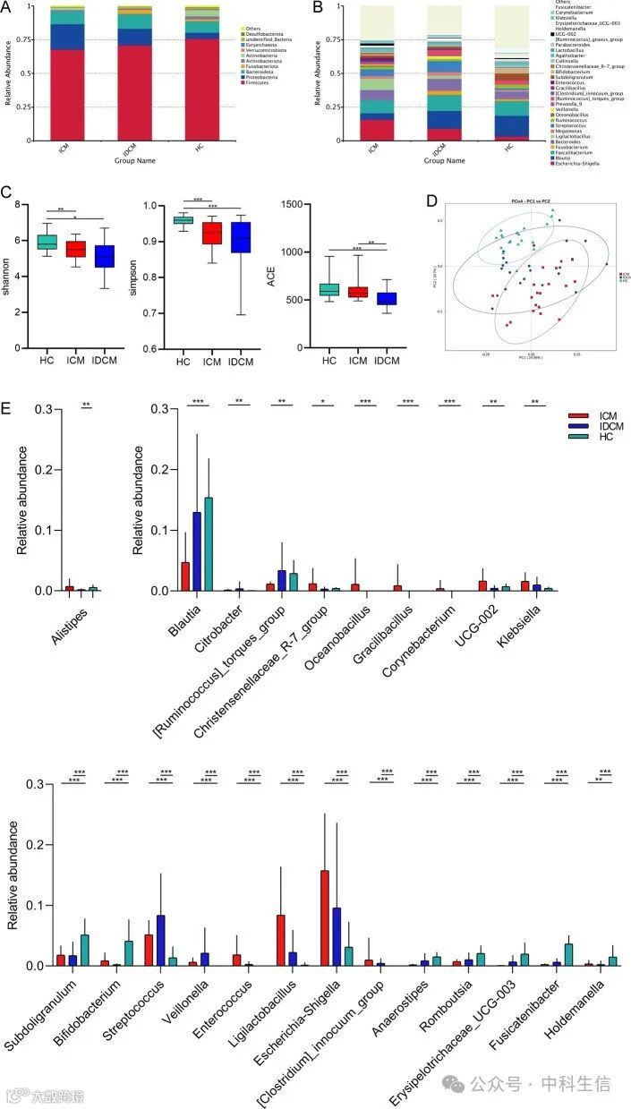 为了研究与DCM亚型相关的肠道微生物特征,评估研究队列中肠道微生物群的多样性和组成。可以观察到,与HC相比,两种DCM亚型的Shannon和Simpson指数测量的α多样性有所下降(Shannon指数:ICM vs HC, p < 0.01, IDCM vs HC, p < 0.05;辛普森指数:ICM vs HC, p < 0.001, IDCM vs HC, p < 0.001;Kruskal-Wallis检验)。两组间Shannon、Simpson指数比较无统计学差异,但ICM组ACE指数高于IDCM组(ACE指数:ICM vs IDCM, p < 0.01;Kruskal-Wallis检验)(图1C)。基于加权单位距离的PCoA用于评估心肌病和HC患者的整体微生物结构。PCoA图显示了ICM、IDCM和HC的不同分类成分(图1D)。这些发现表明不同心肌病亚型的肠道菌群存在生态失调。