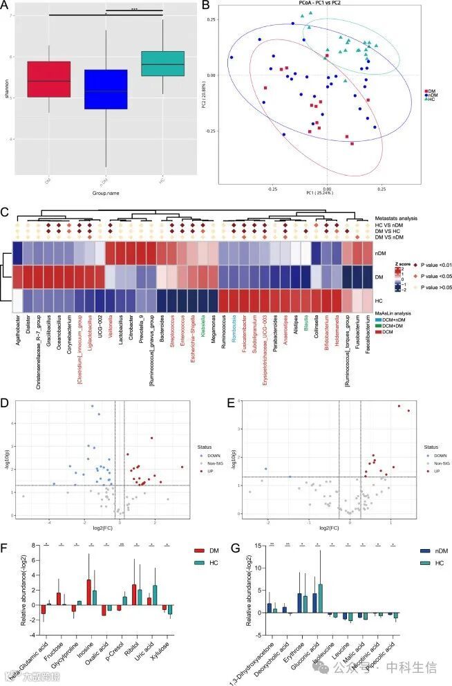 采用分层分析方法,根据DM和HTN状态,探讨DCM患者肠道属和代谢物的相关性。将DCM患者分为DM组(DCM-DM, n = 13)和非DM组(DCM- ndm, n = 29)。与HC相比,两个DCM亚组的Shannon指数均显著降低(DCM- dm vs HC, p < 0.05, DCM- ndm vs HC, p < 0.001)(图3A)。基于加权单位距离的PCoA图显示了DCM-DM、DCM-nDM和HC之间肠道微生物群的异质性(图3B)。在属水平上,与HC相比,DCM-DM中有19个属和DCM-nDM中有18个属的相对丰度存在显著差异(图3C)。校正混杂因素后,在DCM-DM中明显发现Blautia和Klebsiella两个属,而在DCM-nDM中仅发现Romboutsia一个属。此外,我们还发现了12个属属于有和没有DM的DCM(图3C)。同时,根据DM状态对粪便非靶向代谢组学数据进行分层。与HC相比,在DCM-DM和DCM-nDM患者中分别检测到40种和13种差异代谢物(图3D, E)。可能受到药物的影响,在调整了包括降压药物、降糖药物和他汀类药物在内的混杂因素后,我们只发现了9种DCM-DM或DCM-nDM的特异性代谢物(图3F, G)。