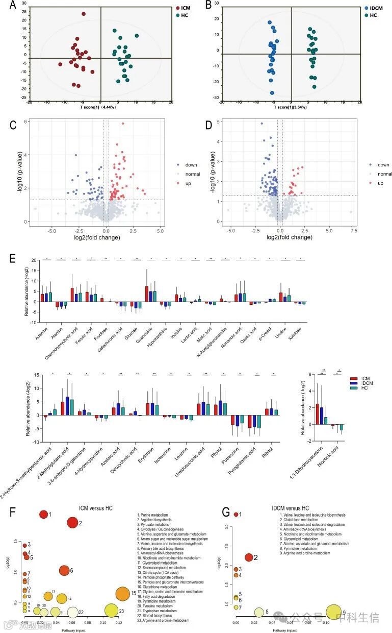 为了研究不同心肌病亚型的代谢变化,采用气相色谱-质谱分析评估了ICM、IDCM和HC患者的粪便代谢物。在粪便样本中共鉴定出70种带注释的代谢物。利用OPLS-DA可视化样本变异性,并识别组间可能的异常点。OPLS-DA评分图显示不同临床组之间代谢物的不同模式(ICM vs HC, R2Y = 0.928, Q2 = 0.481;IDCM与HC, R2Y = 0.991, Q2 = 0.383)(图2A, B)。火山图进一步描述了ICM和IDCM中代谢物的上调和下调。与HC相比,在ICM中发现了11种差异代谢物上调,24种差异代谢物下调,而在IDCM中发现了15种差异代谢物降低,3种差异代谢物升高(图2C, D)。与HC相比,通过一般线性回归分析,在调整了混合因素后,ICM中的20种代谢物和IDCM中的16种代谢物存在显著差异。具体来说,只有两种代谢物(1,3-二羟基丙酮和烟酸)在ICM和IDCM中常见(图2E)。