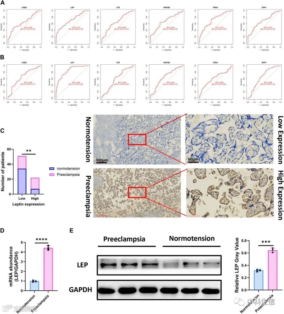 LEP(AUC = 0.712)和 PDK4(AUC = 0.718)对 PE 的早期诊断都有很好的诊断价值(图 6A)。此外,在 GSE75010 数据集中,LEP 的 AUC 为 0.850(图 6B),验证了其强大的分辨能力,表明 LEP 基因具有更高的诊断能力。通过免疫组化评估了 LEP 在 PE 和正常血压组织中的表达,发现 LEP 的高表达与 PE 相关(图 6C;p < 0.05)。为了进一步进行临床验证,使用 qRT-PCR 评估了 LEP 的表达,结果显示 LEP 的高表达与 PE 相关(图 6D;p < 0.05)。使用 Western 印迹法评估了 LEP 在 PE 中的上调情况,发现 LEP 的高表达与 PE 相关(图 6E;p < 0.05)。上述结果表明,LEP 基因具有更高的诊断能力。