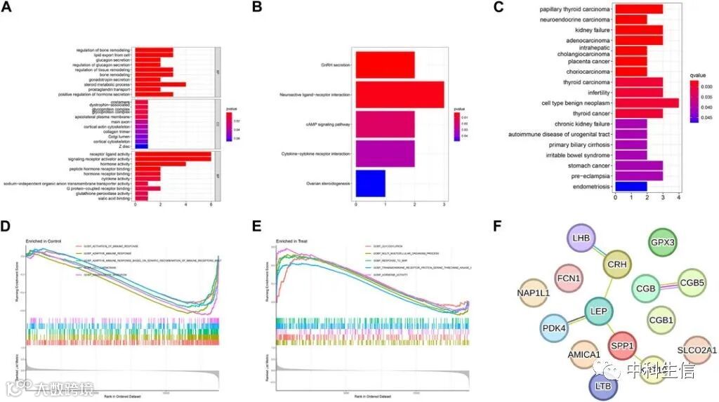 GO分析结果表明,DEGs与激素相关的GO密切相关,如激素活性、类固醇代谢过程、激素分泌的正向调节等,也与受体配体相关的GO密切相关,特别是受体配体活性、信号受体激活剂活性和肽类激素受体结合等(P<0.05,图3A)。此外,KEGG 分析表明,GnRH 分泌、神经活性配体-受体相互作用、cAMP 信号通路和细胞因子-细胞因子受体相互作用均有富集(P<0.05,图3B)。溶解氧富集分析表明,DEGs主要与细胞型良性肿瘤、不孕症、肺栓塞和肾功能衰竭有关(图3C)。GSEA结果显示,在对照组中,富集的功能主要是激活免疫反应、适应性免疫反应和细胞趋化(图3D);在PE组中,富集的功能主要是糖基化、多细胞生物过程和激素活性(图3E)。这些结果确证了免疫反应和激素分泌在 PE 中的重要作用。还得到了一个包含 15 个 DEGs 的 PPI 网络。STRING 工具确定了五个结合蛋白。LEP、LHB、PDK4、SP1 和 KRT19 如图 3F 所示。
