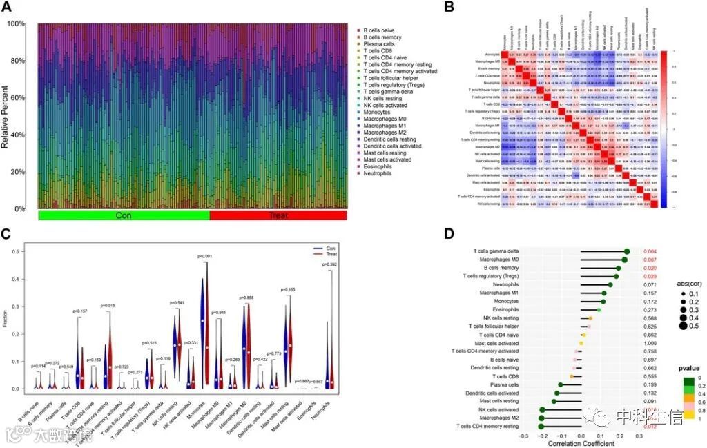 为了进一步验证 LEP 基因与免疫细胞之间的关系,首先应用 CIBERSORT 算法确定了 PE 组和对照组样本中 22 种浸润免疫细胞的比例(图 8A-B)。接着,研究了 PE 组与正常血压组免疫细胞的成分。PE 组的单核细胞比例明显低于正常血压对照组(P < 0.001)。然而,PE 组 CD4 静止记忆 T 细胞的比例(P = 0.015)明显高于正常血压对照组(图 8C)。此外,还研究了 LEP 基因与浸润免疫细胞之间的关系。LEP 与γ δ T 细胞(r = 0.237,p < 0.05)、M0 巨噬细胞(r = 0.224,p < 0.05)、记忆性 B 细胞(r = 0.192,p < 0.05)和调节性 T 细胞(r = 0.181,p < 0. 05),而与静息 CD4 记忆 T 细胞(r = -0.208,p < 0.05)、M0 巨噬细胞(r = -0.205,p < 0.05)和活化 NK 细胞(r = -0.200,p < 0.05)呈负相关(图 8D)。这些结果证明了 LEP 基因对免疫活性的影响。
