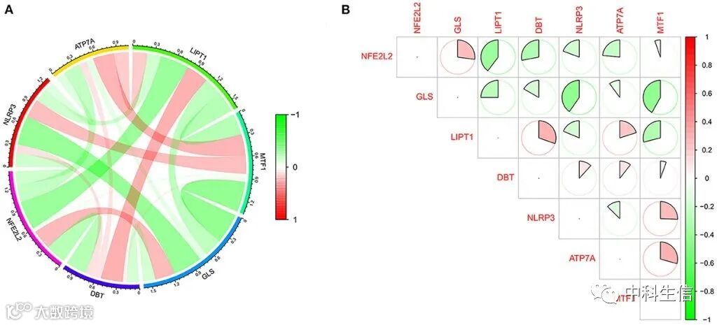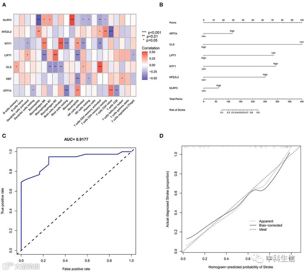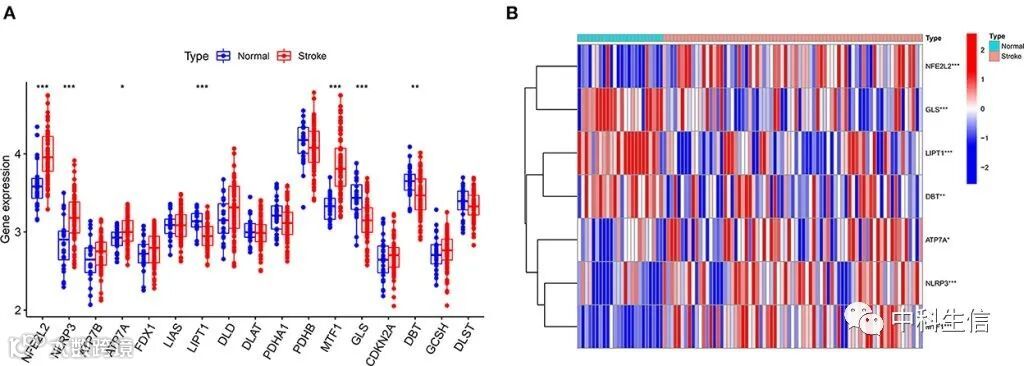 使用CIBERSORT算法来预测22种免疫细胞在IS组和正常组之间的免疫细胞浸润情况。结果显示,IS组的γδT细胞、单核细胞、M0巨噬细胞和中性粒细胞表达上调,而初始B细胞、CD8+T细胞、调节性T细胞(Tregs)和活化的NK细胞在IS组中表达下调(Fig 4)。免疫细胞与DEGs相关性分析显示,NLRP3、NFE2L2、ATP7A、LIPT1、GLS和MTF1被认为是与免疫相关性最强的铜凋亡相关DEGs(Fig 5A)。