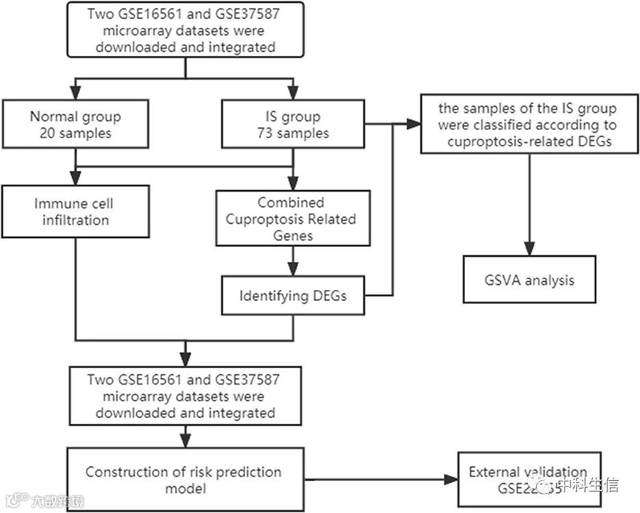 缺血性脑卒中(Ischemic Stroke,IS)是一个复杂的病理过程,具有多种机制,涉及兴奋性毒性、氧化损伤、炎症和Ca2+超载等。越来越多的证据表明,免疫细胞的大量募集在中风急性期发挥着核心作用。浸润性外周免疫细胞和驻留小胶质细胞通过释放炎症相关分子介导神经元细胞死亡和血脑屏障(Blood-Brain Barrier,BBB)破坏。铜凋亡是最近发现的一种细胞死亡形式,其特征是细胞内游离铜积累和蛋白质脂化,导致细胞毒性应激并最终导致细胞死亡。最近的一项研究表明,铜凋亡依赖于线粒体呼吸,即铜直接与三羧酸循环的脂化成分结合,导致脂酰化蛋白聚集和铁硫簇蛋白丢失,导致蛋白毒性应激和细胞死亡。然而,目前尚无关于铜凋亡与免疫浸润和IS进展相关性的研究报道。本研究首次结合IS芯片数据和铜凋亡相关基因阐明了IS铜凋亡介导的免疫浸润的具体机制。