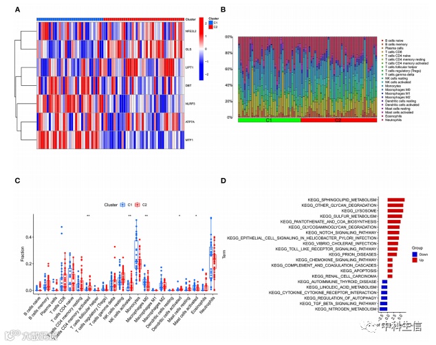 据DEGs的表达,使用“ConsensusClusterPlus” R包进行共识聚类分析,IS组73例患者被分为两个亚组,即C1和C2。C1中NLRP3和MTF1的表达量高于C2,C2中LIPT1和GLS的表达量高于C1。与C1相比,C2中活化的记忆CD4+T细胞、活化的NK细胞和活化的树突状细胞的数量更高。与C2相比,C1中M0巨噬细胞和活化肥大细胞的数量更高。最后利用GSVA评估不同类型之间生物学功能的差异。Fig 7D显示TGF-β信号通路和自噬调节通路在C1中上调。此外,鞘脂代谢和其他聚糖降解等途径在C2中上调。