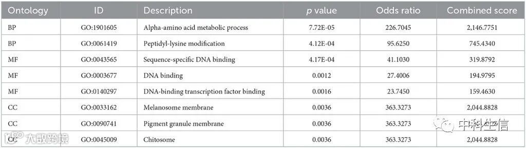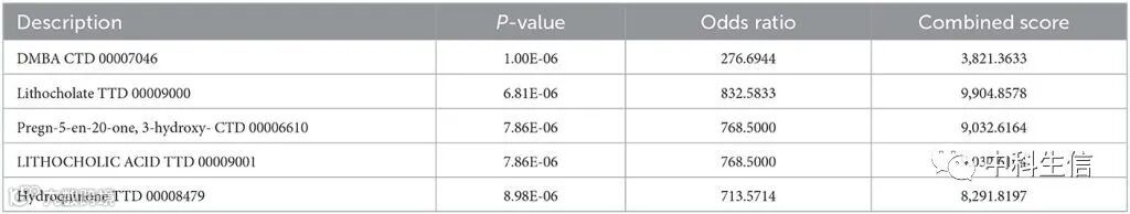 基于二元逻辑构建列线图计算总分,分析IS组的风险概率(Fig 5B)。ROC曲线(AUC = 0.9177)显示列线图对于IS组危险因素的评估具有良好的预测能力(Fig 5C),且校准曲线显示列线图结果与实际结果吻合良好(Fig 5D)。利用Enrichr网站对这6个基因进行GO和KEGG通路分析,主要富集于α-氨基酸代谢过程,DNA结合,黑素体膜和其他过程,富集于D-谷氨酰胺和D-谷氨酸代谢以及脂质和动脉粥样硬化等通路中(Fig 6)。DMBA CTD 00007046、Lithocholate TTD 00009000等候选分子具有潜在的治疗效果(Table 3)。最后,构建了DEGs的miRNA-mRNA 调控网络(Fig 6D)。