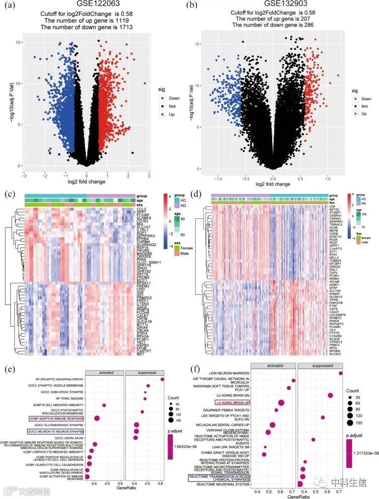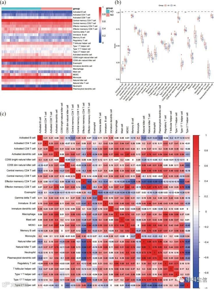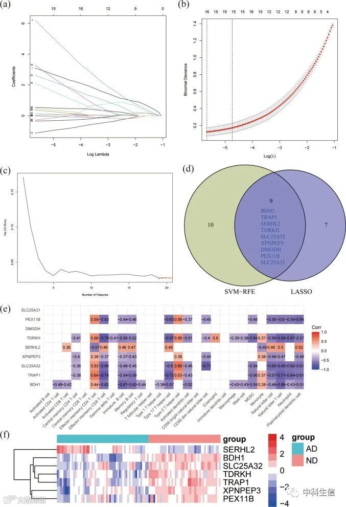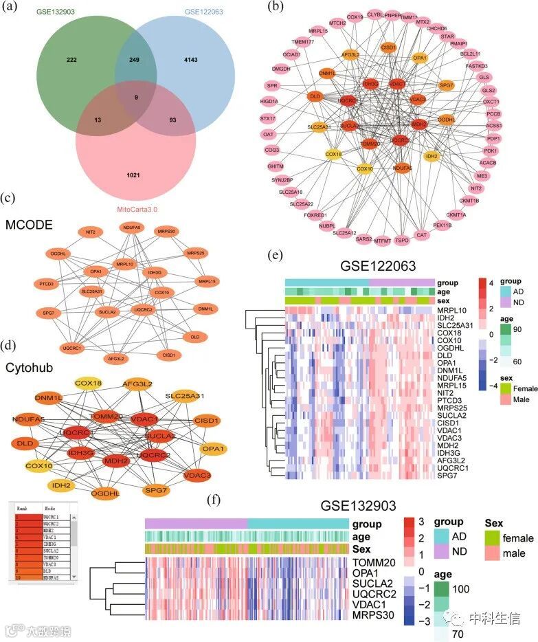 大家好!今天小编和大家分享一篇23年发表在J Transl Med(IF:7.4)杂志的文章《Identification of mitochondrial related signature associated with immune microenvironment in Alzheimer’s disease》。作者通过GEO数据库探索潜在的分子机制,分析线粒体相关基因在AD发生中的作用及其与免疫浸润的关系,有助于更好地理解AD发生中的免疫代谢。 背景阿尔茨海默病(AD)是一种进行性神经退行性疾病,是痴呆的主要病因,占痴呆患者的60-80%。AD主要表现为记忆丧失和认知障碍,患者独立进行日常活动的能力下降。老年(65岁以上)和携带载脂蛋白ε4 (APOE ε4)等位基因是AD的最大危险因素。新的生物标志物,包括PET扫描和血浆测量淀粉样蛋白β (Aβ)和磷酸化tau (p-tau),对AD的诊断有很大帮助。除了生化淀粉样蛋白和tau蛋白病理是AD的核心特征外,小胶质细胞反应、血管系统、血脑屏障、外周免疫系统、淋巴和其他清除系统,以及潜在的胃肠道微生物组也影响疾病的临床进展。目前对AD的治疗包括认知改善疗法、神经精神症状治疗和疾病修饰疗法。但有些药物仍在研究中,并不是很有效。因此,在AD的诊断和治疗方面取得新的进展仍然是一项紧迫的任务。已有大量证据表明先天免疫和适应性免疫反应参与了AD的发生或进展。最近研究发现,T细胞浸润增加可促进T细胞与小胶质细胞之间的串扰,从而进一步加速神经炎症。同样,外周B淋巴细胞可以进入AD患者的中枢神经系统,突破血脑屏障,通过与脑细胞相互作用,促进免疫反应的激活。AD不同阶段循环中性粒细胞的表型变化影响全身慢性炎症和认知能力下降的速度。自然杀伤细胞、外周树突状细胞和肥大细胞都与AD损伤风险增加有关。这些发现强调了免疫细胞在AD中的关键作用。线粒体是维持细胞能量代谢不可缺少的细胞器,也是维持细胞生物学功能不可缺少的信号细胞器。降低氧化应激水平、调节线粒体代谢、增强线粒体生物发生的化合物可能是通过恢复线粒体稳态来延缓衰老和治疗神经退行性疾病的潜在方法。Auwerx等人的研究表明,增加线粒体蛋白质停滞可以降低淀粉样蛋白-β蛋白毒性。此外,Fang等人发现,线粒体自噬损伤通过增加氧化损伤和线粒体能量缺陷影响Aβ和Tau积累,从而导致认知缺陷。同时,线粒体miRNA也被证明影响ATP的产生、氧化应激、线粒体动力学,从而调节AD的进展。通过改善线粒体功能来预防AD的药物已被广泛研究,如线粒体裂变蛋白抑制剂、促进融合的药物以及抗氧化剂,包括MitoQ、维生素E和姜黄素。线粒体看门蛋白VDAC1已被证明是一种有希望的AD候选药物。然而,线粒体基因与免疫微环境之间的串扰在AD中的研究很少。基于线粒体在AD发生发展中的重要作用,我们将进一步了解线粒体相关基因在调节线粒体功能和免疫进展中的作用,从而为AD的发病机制和诊断提供一定的参考价值。我们通过检索GEO数据库探索潜在的分子机制,分析线粒体相关基因在AD发生中的作用及其与免疫浸润的关系,有助于更好地理解AD发生中的免疫代谢。 研究流程
