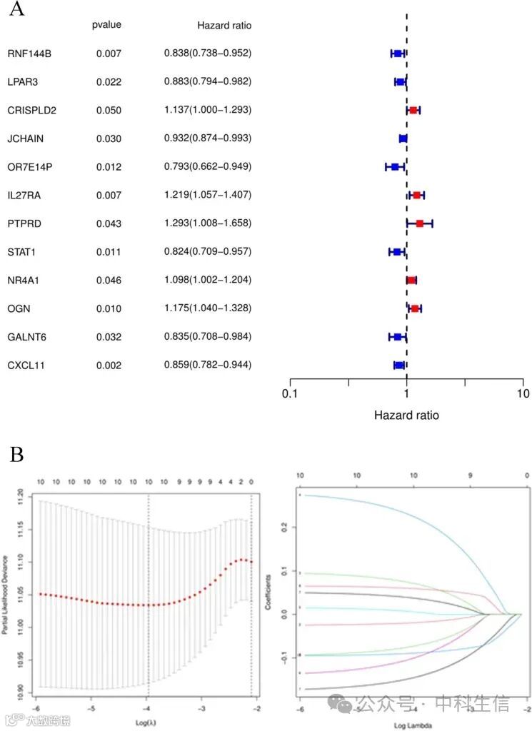 采用单因素Cox法,采用128个常用DEGs分析OC患者的预后。共有12个关键基因与OC患者预后密切相关:RNF144B、LPAR3、CRISPLD2、JCHAIN、OR7E14P、IL27RA、PTPRD、STAT1、NR4A1、OGN、GALNT6和CXCL11(图2A)。然后,我们利用这些表达谱来构建预后模型。开发了以下风险评分公式:风险评分 = RNF144B*(-0.1441) + LPAR3*(-0.0187) + CRISPLD2*0.0701 + IL27RA*0.2226 + PTPRD*0.0055 + STAT1*(-0.0988) + NR4A1*0.0369 + OGN*0.0590 + GALNT6*(-0.0718) + CXCL11*(-0.0886)。接下来,我们将这些OC患者分为高风险组和低风险组,并根据风险评分公式计算中位风险评分(图2B)。