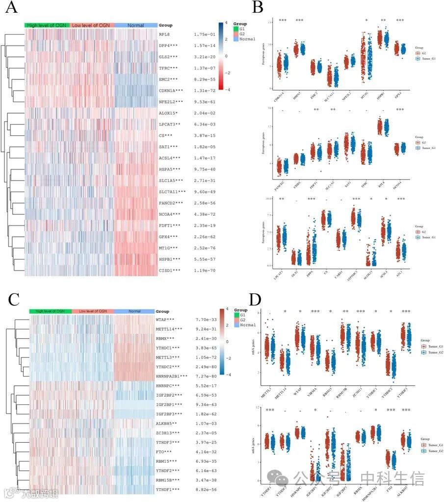 铁死亡和 m6A 甲基化参与 OC 的发生和发展。我们首先使用TCGA数据库来分析OGN水平是否与铁死亡相关。基于TCGA和GTEx数据库,对OC和卵巢组织样本中OGN表达与25个铁死亡基因的相关性分析(图8A)。结果显示,OC与正常卵巢之间25个铁死亡基因的表达差异有统计学意义。此外,我们还证实了OC样本中铁死亡基因与OGN的相关性。我们发现OGN水平与MT1G、HSPB1、GPX4、FDFT1和ATP5MC3呈正相关,与CDKN1A、HSPA5、SLC1A5、NCOA4、LPCAT3、DPP4、ALOX15、ACSL4和ATL1呈负相关(图8B)。然后,基于TCGA和GTEx数据库提取OC和正常卵巢样本中20个m6A甲基化基因的表达谱(图8C)。结果表明,这些m6A甲基化调节因子在OC进展中起关键作用。我们进一步进行了这些m6A调节因子与OGN表达之间的相关性分析。结果显示,METTL14、WTAP、VIRMA、RBM15、RBM15B、ZC3H13、YTHDC1、YTHDC2、YTHDF3、YTHDF1、IGF2BP2、HNRNPA2B1、FTO和ALKBH5与OC患者OGN表达呈显著正相关(图8D)。综上所述,这些结果表明OGN可能在OC铁死亡和m6A甲基化修饰中具有另一个重要功能。