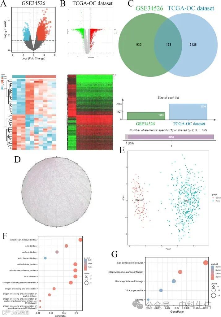 首先,我们发现 PCOS 患者与正常女性相比有 1061 个 DEGs,基于 GEO 数据库的 GSE34526 数据集,与基于 TCGA 数据库的 OC 数据集的正常卵巢样本相比,OC 患者样本中有 2254 个 DEG(图 1A,B)。此外,我们在PCOS和OC进展中发现了128个常见的DEGs(图1 C)。我们还构建了一个蛋白质-蛋白质相互作用(PPI)网络,以识别PCOS和OC数据集中的所有120个基因。使用GeneMANIA数据库对这些网络进行可视化(图1 D),这表明这些基因具有密切的相互作用。PCA发现,这些DEGs的表达可以很好地区分卵巢癌(蓝色)和正常(红色)组织(图1 E)我们基于DAVID数据库提取了这些基因的GO和KEGG通路数据。关于GO富集方面,这些基因富集于细胞粘附分子结合、肌动蛋白结合、钙粘蛋白结合、肌动蛋白丝结合、细胞-底物连接、细胞-底物粘附连接、黏着斑、含胶原的细胞外基质以及抗原加工和呈递(图1 F)。关于KEGG富集方面,这些基因富集于细胞粘附分子、金黄色葡萄球菌感染、造血细胞谱系、病毒性心肌炎和哮喘中(图1G)。综上所述,这些结果表明,常见的DEGs突出了细胞粘附在PCOS和OC之间关系中的重要作用。