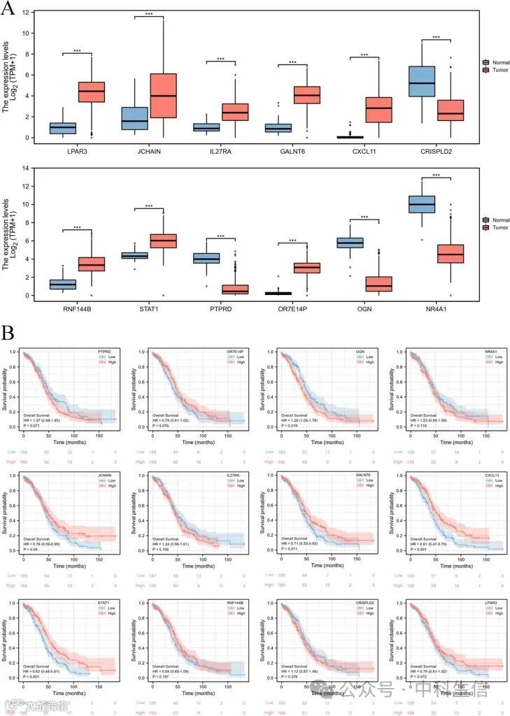 接下来,我们使用箱线图可视化OC样本中12基因特征的mRNA水平,表明OC患者LPAR3、JCHAIN、IL27RA、GALNT6、CXCL11、RNF144B、STAT1和OR7E14P显著升高,但OC患者CRISPLD2、PTPRD、OGN和NR4A1明显降低(图5A)。我们还从TCGA数据库中确认了OC患者中12个基因特征的总生存率。结果显示,OGN与OC患者预后呈显著负相关,而JCHAIN、GALNT6、CXCL11和STAT1与OC患者预后呈显著正相关(图5B)。这些结果表明,JCHAIN、GALNT6、CXCL11、STAT1和OGN可能在OC患者进展中起关键作用。