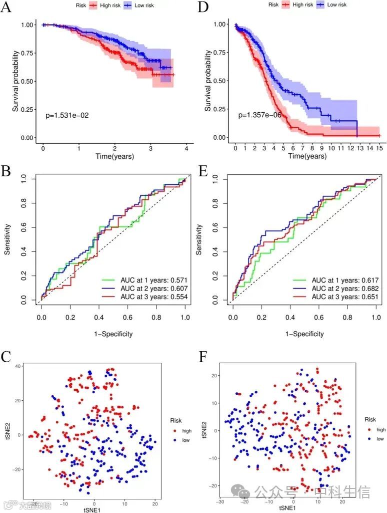 和比率显着降低(图4A)。在ROC曲线下,1、2和3年的AUC分别为0.571、0.607和0.554,表明中等潜伏期可作为生存监测中12个关键基因表达谱的预后标志物(图4B)。然而,t-SNE分析显示,基于TCGA数据库,不同风险组的OC患者在两组中没有分布(图4C)。为了验证从TCGA-OC队列构建的预后模型的有效性,我们使用训练队列的中位数将GSE140082队列中的OC患者分为高风险组和低风险组。与训练队列的结果相似,与低风险组中的其他OC患者相比,高风险OC患者的预后较差(图4D). 试验队列中 1、2 和 3 年的 AUC 值分别为 0.617、0.682 和 0.651(图 4E)。此外,t-SNE分析结果与训练队列的结果相似(图4F),提示 12 个基因特征不能作为 OC 患者的诊断标志物。