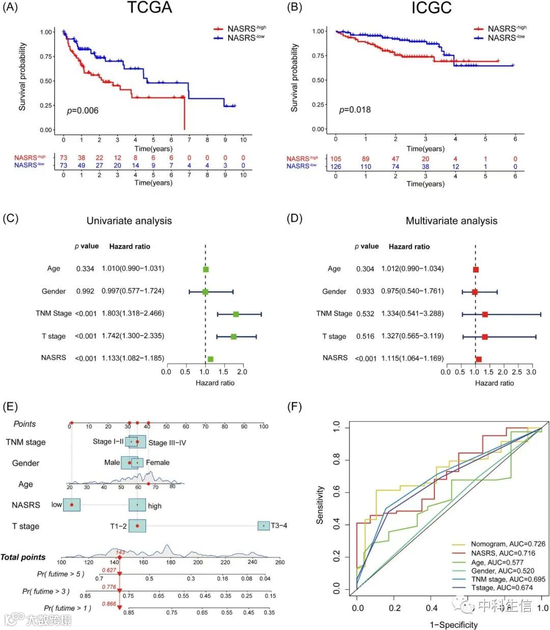 (A、B) Kaplan-Meier生存曲线显示TCGA和ICGC数据集中高NASRS组和低NASRS组之间的OS。