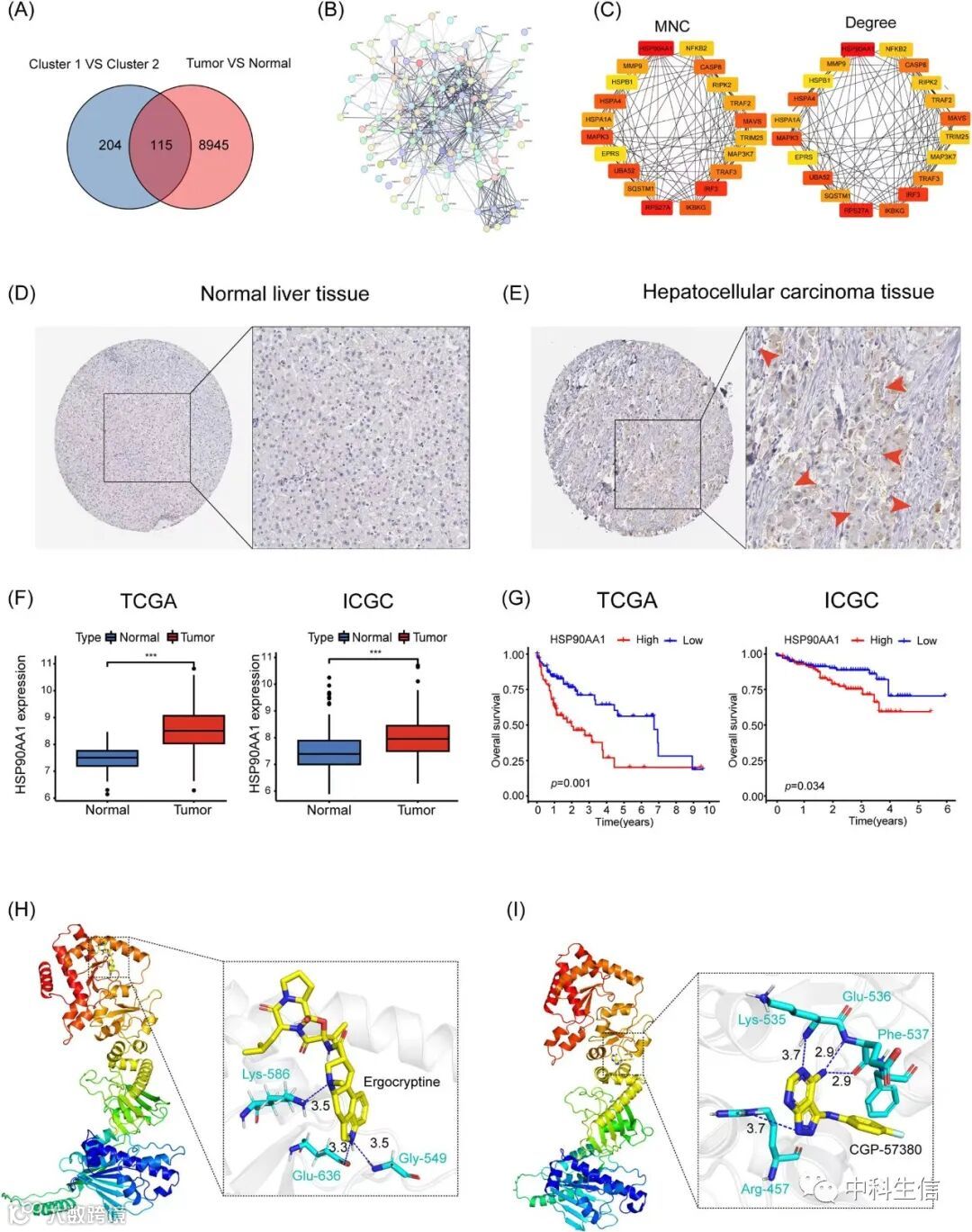 (G) Kaplan-Meier生存曲线分别显示了TCGA和ICGC数据集中HSP90AA1的预后价值。