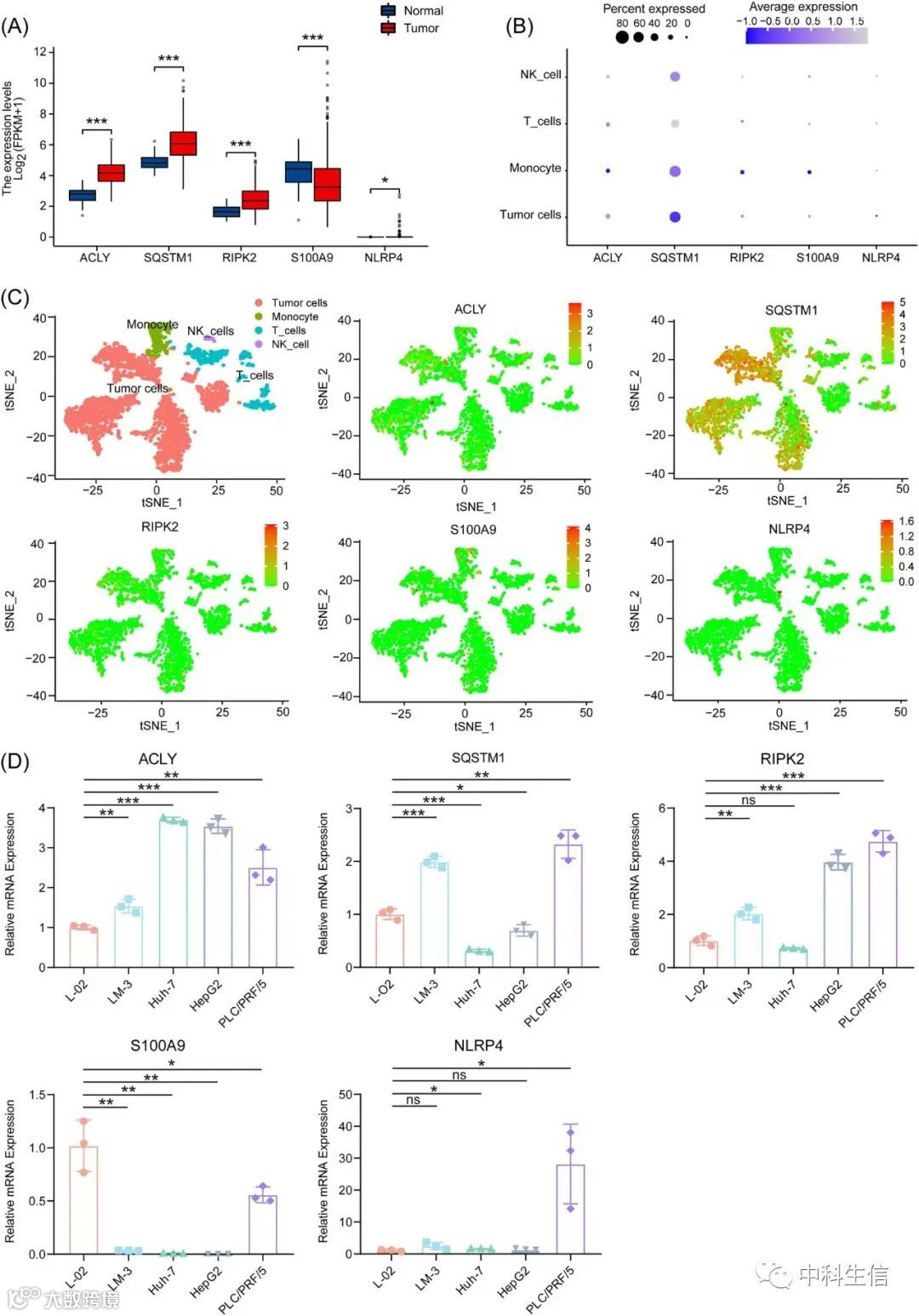 三、5个候选基因在单细胞测序和HCC细胞系中的表达水平验证。