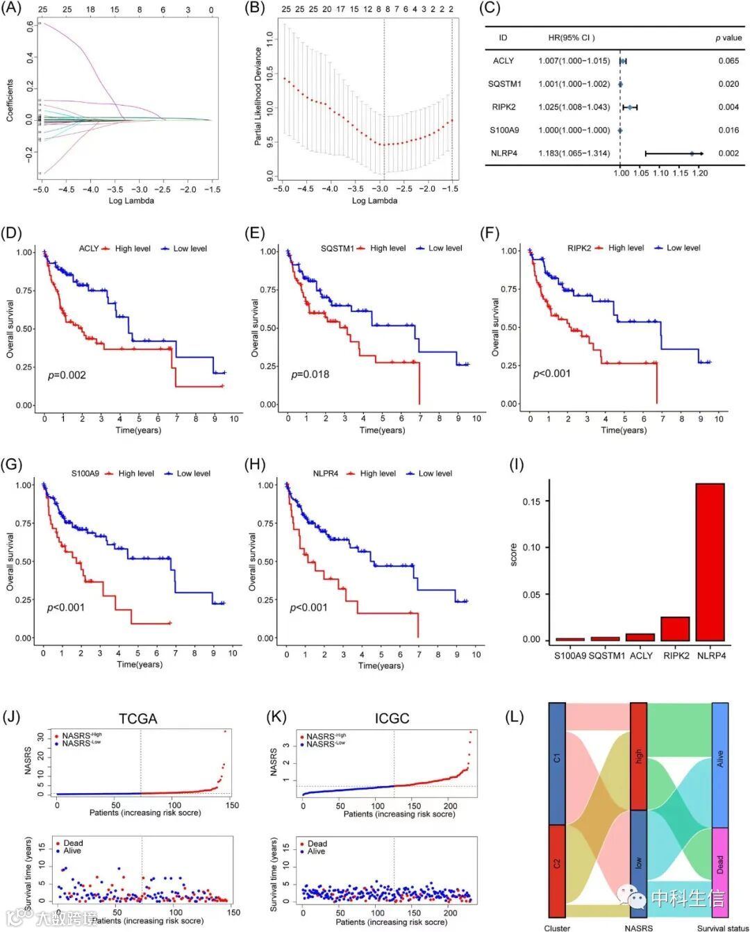 二、预后核酸感应相关风险评分(NASRS)的构建与验证。