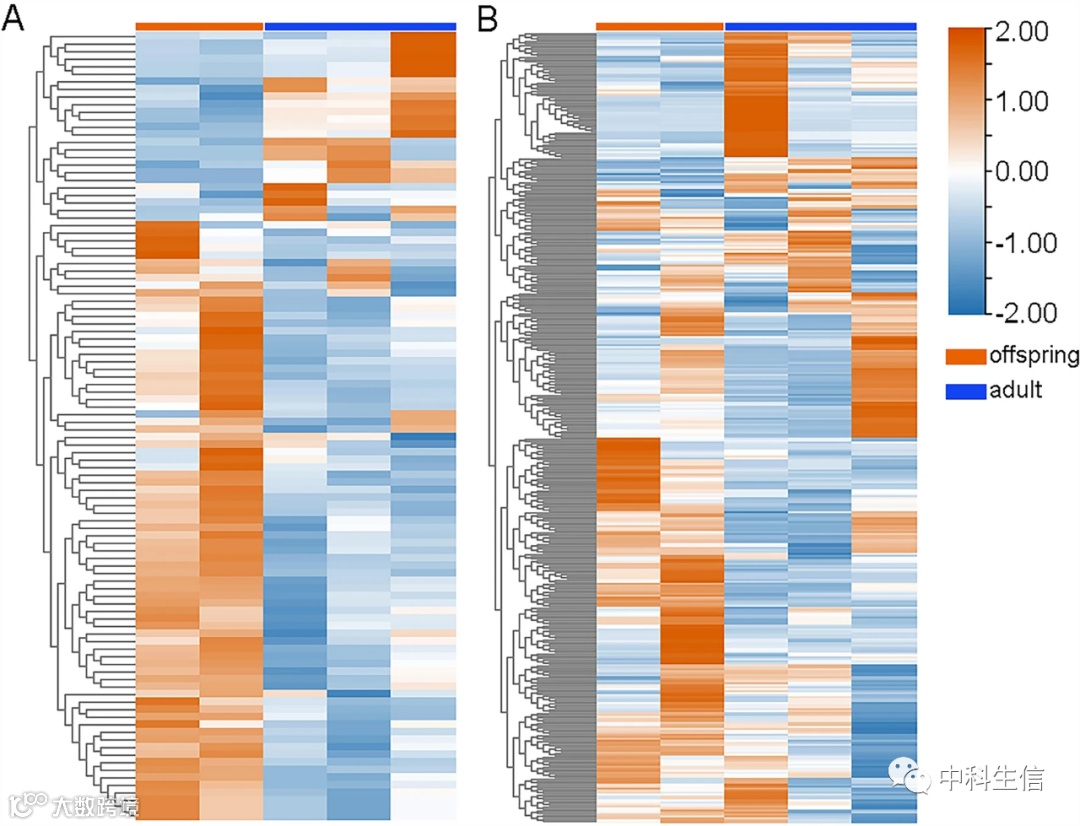如图2和图3所示,对照组和BPA组中分别有99个(77个上调,22个下调)和354个(234个上调,120个下调)DEGs。接下来对不同组的DEGs进行了GO富集。如图4A,对照组中细胞骨架组装、蛋白质、着丝粒、钙离子和染色体姐妹分离相关通路在后代中比成人更活跃。在BPA组中(图4B),发现后代对激酶活性、骨骼肌和肾脏发育过程以及中性粒细胞迁移的反应更敏感。重要的是,肽反应胰岛素分泌增加,这强烈暗示BPA干扰了胰腺的正常功能,后代比成人对BPA表现出更高的敏感性。