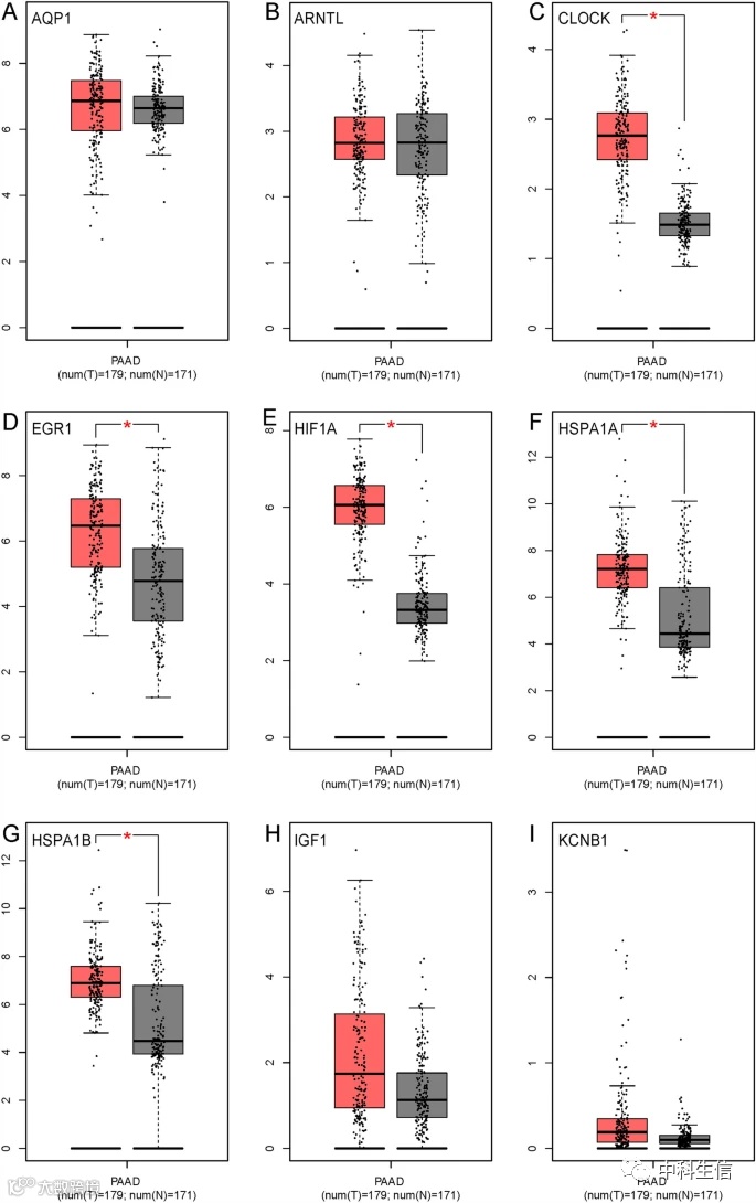 将交互节点不少于5个的基因上传到 CTD 数据库(9个DEG),汇总了每个关键和调节DEG相关的前5个疾病。进一步检测了肿瘤和正常人群中的基因表达。如图7所示,与正常人群相比,肿瘤人群中的CLOCK,EGR1,HIF1A,HSPA1A和HSPA1B显著上调,而其他保持不变。