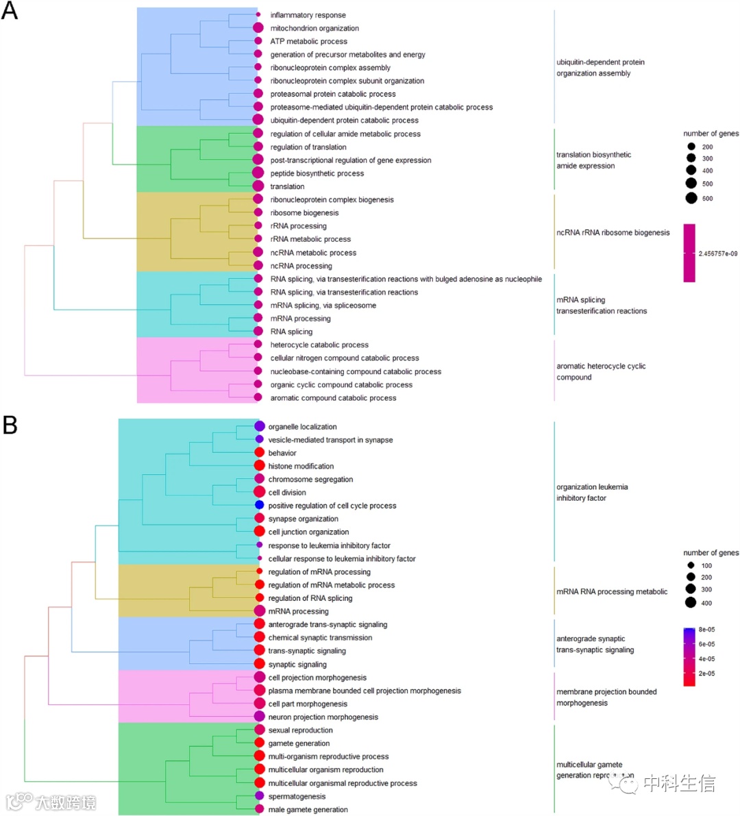将对照组和BPA组分为三对(母源性与直接性、母体暴露与直接暴露、GSEABPA与GSEACon)进行GSEA富集分析。结果表明GSEACon主要富集在泛素依赖的蛋白质组织组装、翻译生物合成酰胺表达、ncRNA rRNA核糖体生物发生、mRNA剪接酯交换反应和芳香杂环化合物(图1A)。GSEABPA主要是与组织白血病抑制因子、mRNA RNA过程代谢、顺行突触跨突触信号、膜投射边界形态发生和多细胞配子产生繁殖相关的生物学过程有关(图1B)。有趣的是,两组都包括核糖体rna相关的代谢过程或蛋白质生物合成过程,其中大部分被激活。这表明,与直接暴露组和对照组相比,母体暴露增强了细胞活性。然而,具体的活化过程需要进一步探索。
