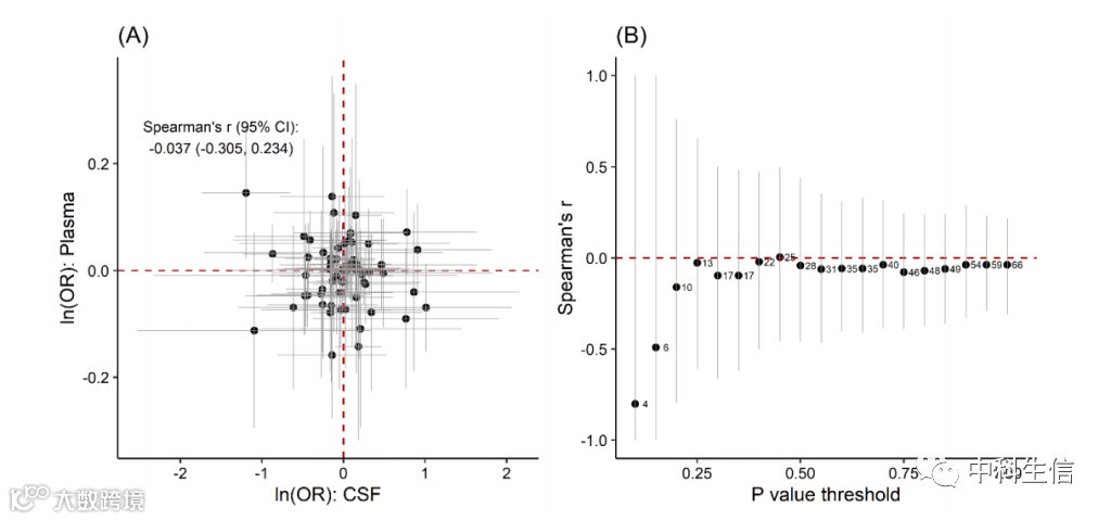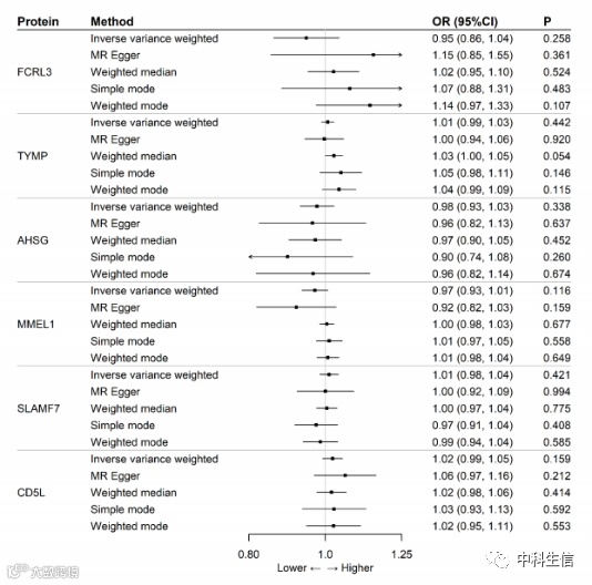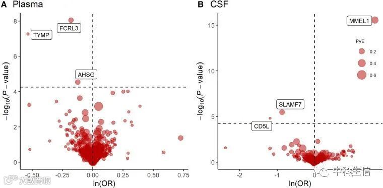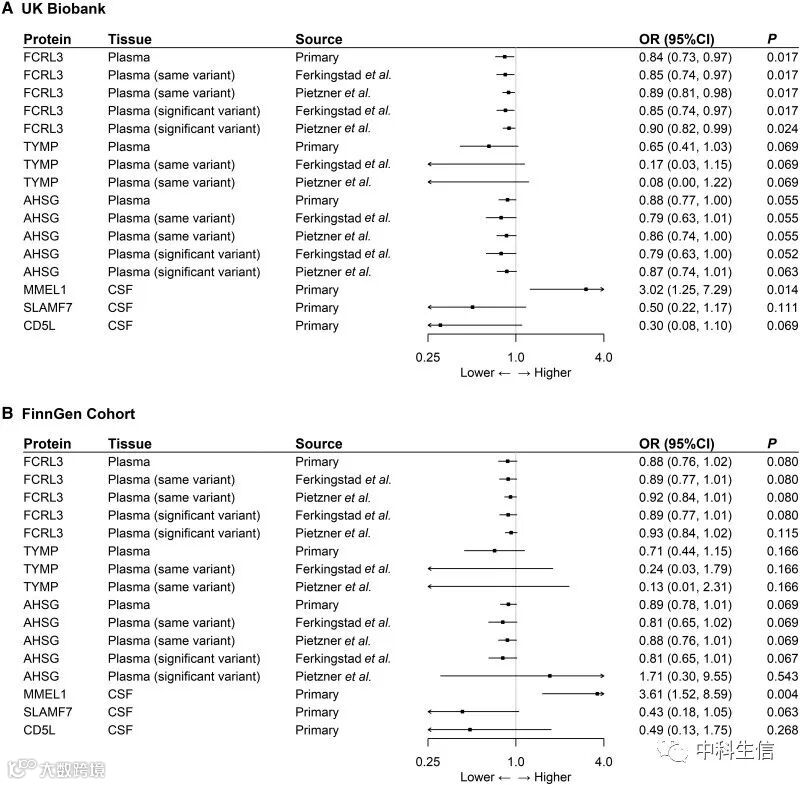 在Bonferroni显著性(P < 5.63 × 10-5)条件下,MR分析发现了6个蛋白质(表1和图2 A和B),包括血浆中的FCRL3、TYMP、AHSG,以及脑脊液中的MMEL1、SLAMF7和CD5L。主要分析中未发现上述蛋白质具有异质性。