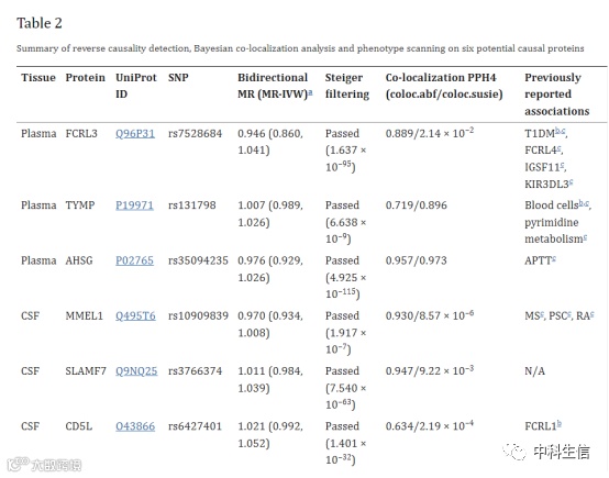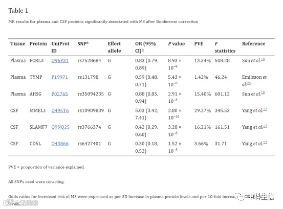 综合分析表明,FCRL3、TYMP、AHSG、CSF、 MMEL1和SLAMF7水平与多发性硬化症风险有因果关系。以上蛋白可能是多发性硬化症有吸引力的药物靶点,尤其是FCRL3和SLAMF7。但这些蛋白在多发性硬化症中的作用有待进一步研究。