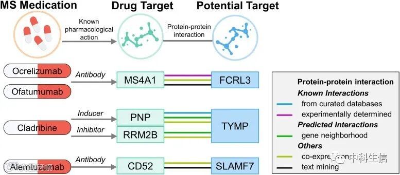 PPI网络展示了三个蛋白质(FCRL3、TYMP和SLAMF7)与四种当前多发性硬化症药物靶点之间的相互作用(图 3、补充图 4)。FCRL3与B淋巴细胞抗原 CD20(MS4A1)相关,而 CD20 是奥克雷珠单抗和奥妥木单抗的靶点。FCRL3 和 MS4A1 有物理相互作用。TYMP与克拉利宾的两个靶点有关,即嘌呤核苷磷酸化酶(PNP)和核糖核苷酸还原酶调节TP53诱导亚基M2B(RRM2B)。SLAMF7 与阿仑妥珠单抗的靶点 CAMPATH-1 抗原(CD52)有关。在 Drugbank 数据库中发现了两种与靶点蛋白相关的药物:氟尿嘧啶(TYMP 的诱导剂)和艾乐妥珠单抗(SLAMF7 的调节剂)。