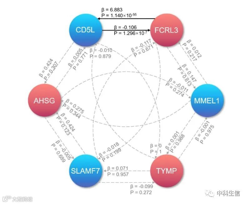 在蛋白质水平上,脑脊液和血浆 MR 结果之间存在不显著的负相关(斯皮尔曼相关系数 = -0.037,蛋白质数量 = 66,无 P 值阈值)。 PPI 网络分析表明,血浆中的 AHSG 和脑脊液中的 CD5L可能存在联系(附图 4)。蛋白-蛋白MR还显示,血浆FCRL3水平升高会导致脑脊液CD5L升高(β = 6.883,P = 1.140 × 10-66),而脑脊液CD5L升高会反向降低血浆FCRL3(β = -0.106,P = 1.296 × 10-7)(附图5)。