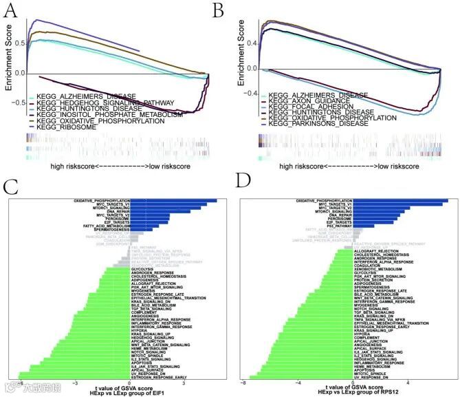 我们通过GSEA和GSVA分析了关键基因参与的信号通路。GSEA结果显示,EIF1在高表达组中显著富集于核糖体、Hedgehog信号通路和氧化磷酸化通路(图6.C);而RPS12在高表达组中显著富集于轴突导向、粘着斑和氧化磷酸化通路(图6.D)。GSVA数据库分析同样揭示了EIF1和RPS12所参与的KEGG信号通路及调控这些通路的相关基因(图6.A,图6.B)。