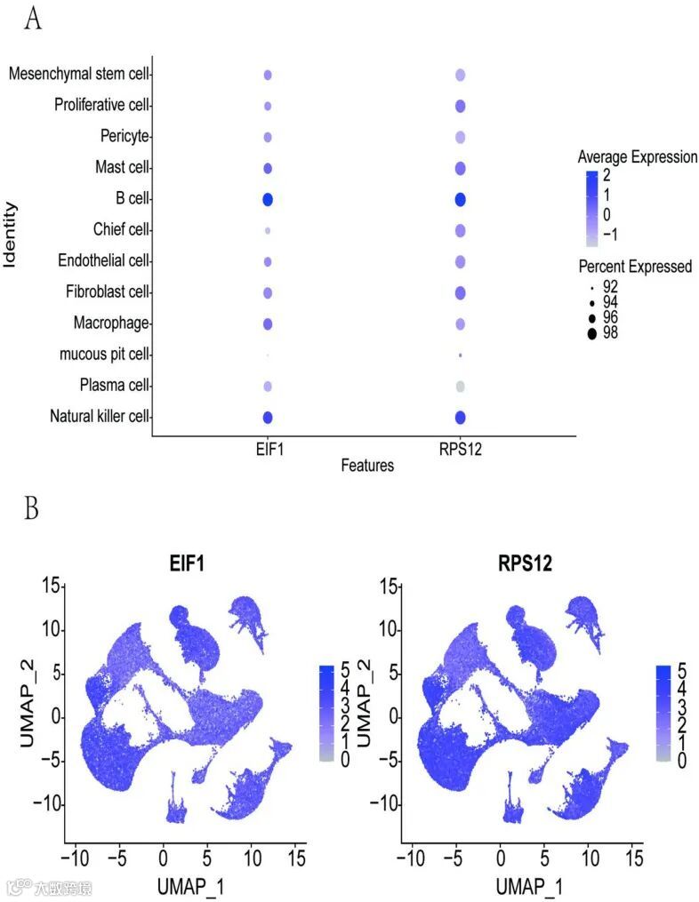 单细胞数据表达分析显示,EIF1和RPS12在包括间质干细胞、增殖细胞、周细胞、肥大细胞、B细胞、主细胞、内皮细胞、成纤维细胞、巨噬细胞、粘液颈细胞、浆细胞和自然杀伤细胞在内的所有12种细胞类型中均有表达(图8.A,图8.B)。