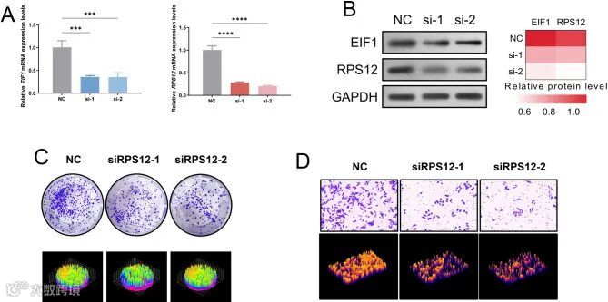 生物信息学的发现是否经得起实践的检验?研究团队在胃癌细胞系中进行了功能验证。当使用siRNA技术“敲低”EIF1或RPS12的表达后,胃癌细胞的增殖能力和迁移能力均显著下降。这一结果在分子(mRNA和蛋白水平)和功能(克隆形成和Transwell实验)两个层面均得到证实,有力地支持了EIF1和RPS12是驱动胃癌进展的功能性癌基因。