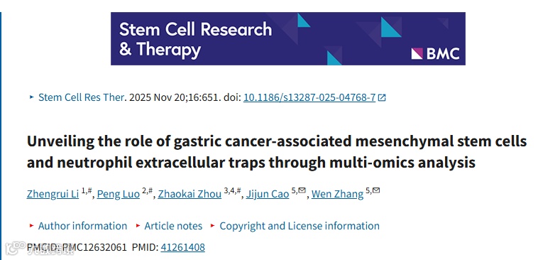 胃癌是一种起源于胃黏膜上皮的恶性肿瘤,以其高侵袭性、易转移和预后差而著称。它的发生与多种因素密切相关,包括幽门螺杆菌感染、吸烟、不良饮食习惯、遗传因素等。传统上,胃癌的研究和治疗大多聚焦于癌细胞本身。然而,近年来,科学家们逐渐认识到,癌细胞所处的“土壤”——肿瘤微环境,在肿瘤的发生、发展、免疫逃逸和治疗抵抗中扮演着至关重要的角色。肿瘤微环境是一个复杂的生态系统,其中不仅包括癌细胞,还充斥着各式各样的“帮凶”细胞,例如:癌症相关成纤维细胞、免疫细胞(如T细胞、B细胞、巨噬细胞、中性粒细胞)、间充质干细胞、血管内皮细胞等;在这些细胞中,胃癌症相关间充质干细胞(GC-MSCs)作为一种多能干细胞,受到了越来越多的关注。它们被招募到肿瘤区域后,并非“救死扶伤”,反而会被“策反”,通过分泌各种细胞因子,为癌细胞的生长、血管生成和免疫逃逸 提供支持,甚至直接促进癌细胞的侵袭和转移。另一方面,作为人体免疫“先锋”的中性粒细胞,也被发现在肿瘤微环境中“叛变”。它们会释放一种名为中性粒细胞胞外诱捕网(NETs)的特殊武器。NETs本是中性粒细胞用来捕杀大型病原体的“天罗地网”,由DNA、组蛋白和多种杀菌蛋白构成。更有研究发现,GC-MSCs能够主动招募中性粒细胞,并诱导其形成NETs,从而共同构建一个有利于肿瘤进展的微环境。