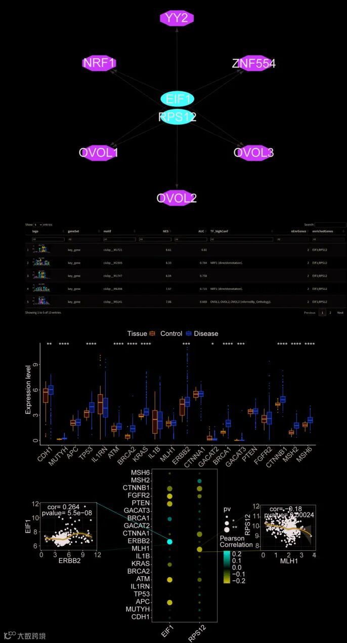 我们对关键基因进行了转录调控分析。结果显示,EIF1和RPS12受到多个转录因子的共同调控(图7.A)。 motif富集分析发现,motif cisbp_M1721具有最高的归一化富集分数(NES: 8.61)(图7.B)。通过GeneCards数据库筛选出胃癌疾病相关基因,并发现关键基因与这些疾病基因(如CDH1, MUTYH, TP53等)的表达存在显著差异且密切相关,例如EIF1与MLH1呈正相关(cor = 0.264),而RPS12与MLH1呈负相关(cor = -0.18)(图7.C)。