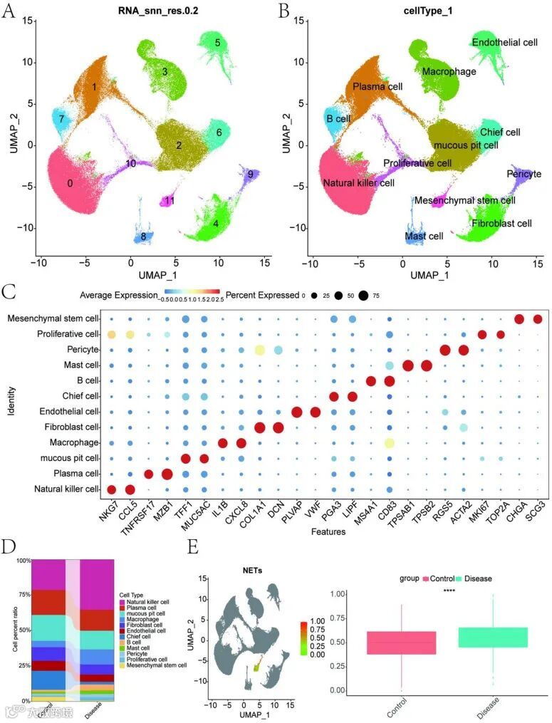 1. 单细胞测序揭示胃癌微环境细胞异质性,并发现疾病组中与间质干细胞相关的NETs评分显著升高