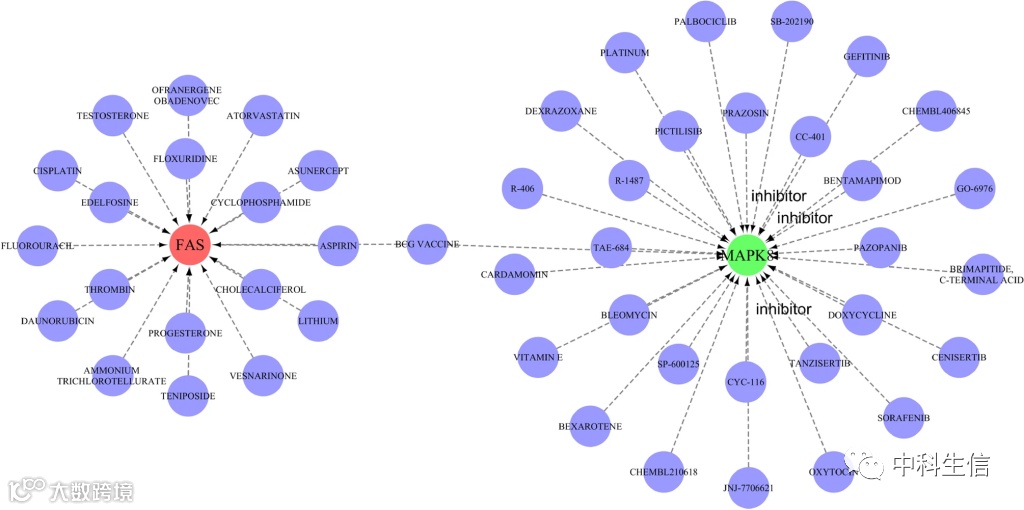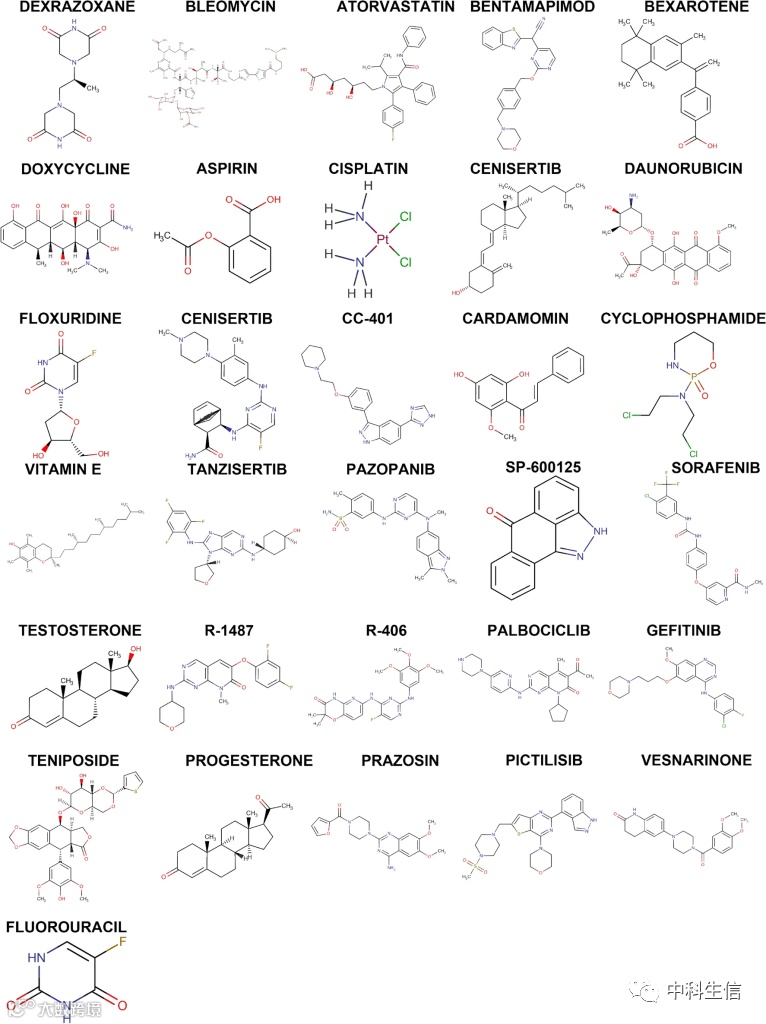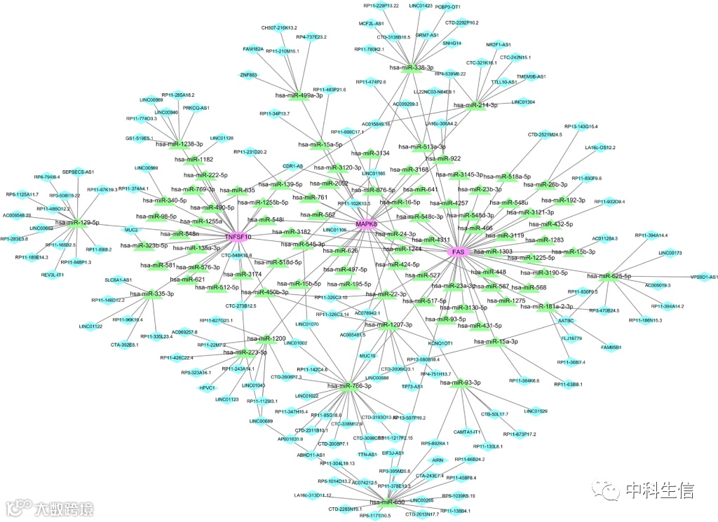 DGIdb数据库可能靶向药物的发现,Cytoscape软件在图6中显示了结果。靶向签名基因的药物48种,其中FAS靶向19种,靶向MAPK8的39种,TNFSF10未发现相关靶向药物。值得注意的是,在预测的靶向药物中,TANZISERTIB,CC-401和BENTAMAPIMOD是已知的MAPK8抑制剂。此外,通过DrugBank数据库检索了相关靶标药物的结构式,如图7所示。在预测的48种靶向药物中共检索到31个化学结构式。下一步是使用starBase和Miranda数据库构建ceRNA网络。如图8所示网络由238个节点(3个关键基因、87个microRNA和148个lncRNA)和264个边缘组成。调节FAS的lncRNA的数量包括59个lncRNA,它们竞争结合has-miR-650,has-miR-625-5p,has-miR-766-3p和has-miR-338-3p。在ceRNA网络中,20个lncRNA可以与has-miR-93-3p,has-miR-1238-3p和has-miR-214-3p结合,以调节关键基因MAPK8。has-miR-1238-3p和has-miR-214-3p调节关键基因MAPK8。关于TNFSF10,共有26个miRNA参与调控。